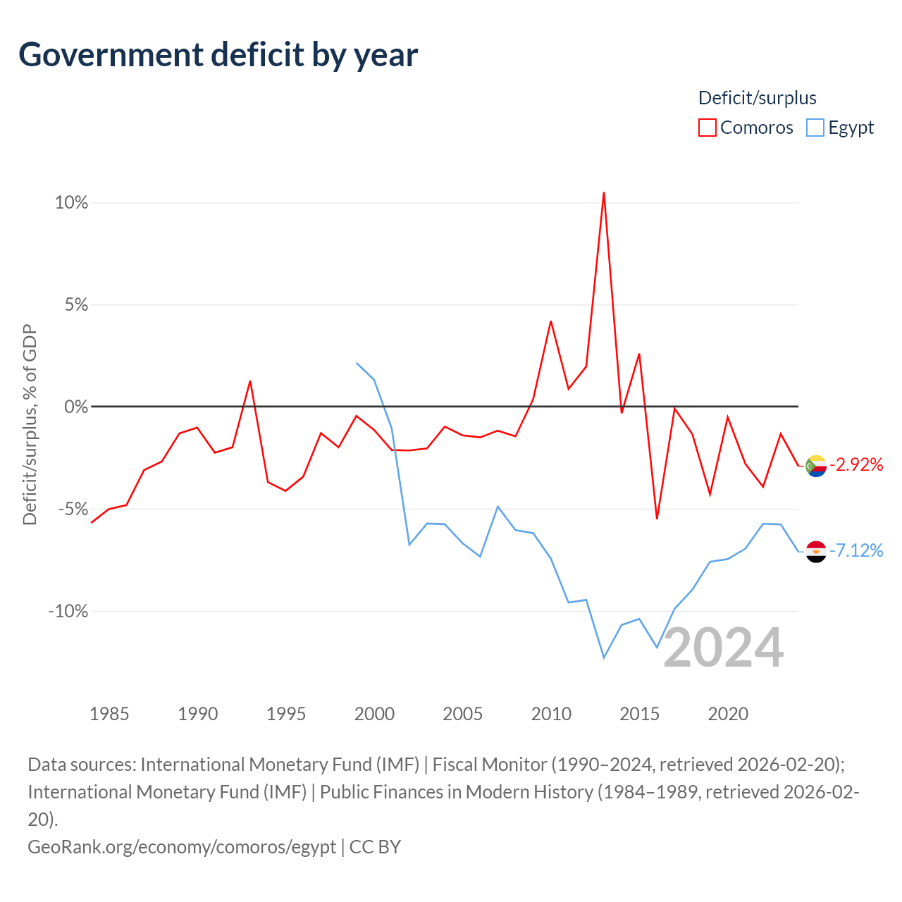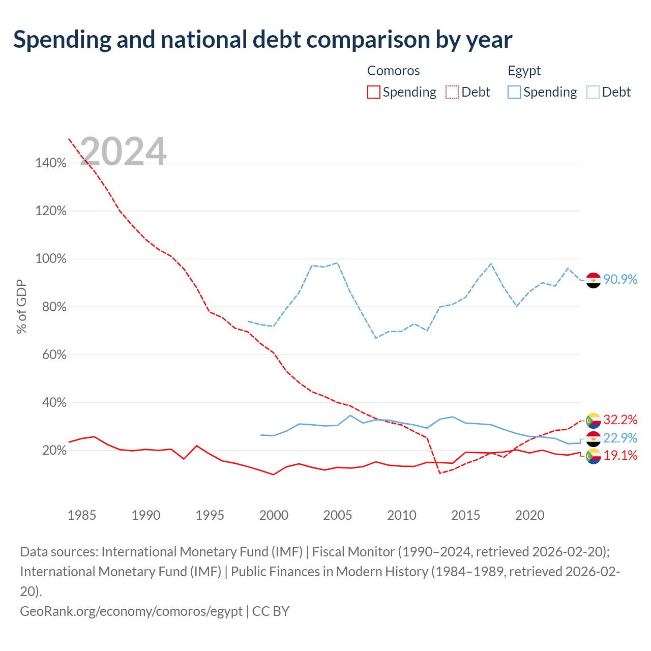Comoros has $463M in government debt (32.2% of GDP), compared to $354B (90.9% of GDP) in Egypt.