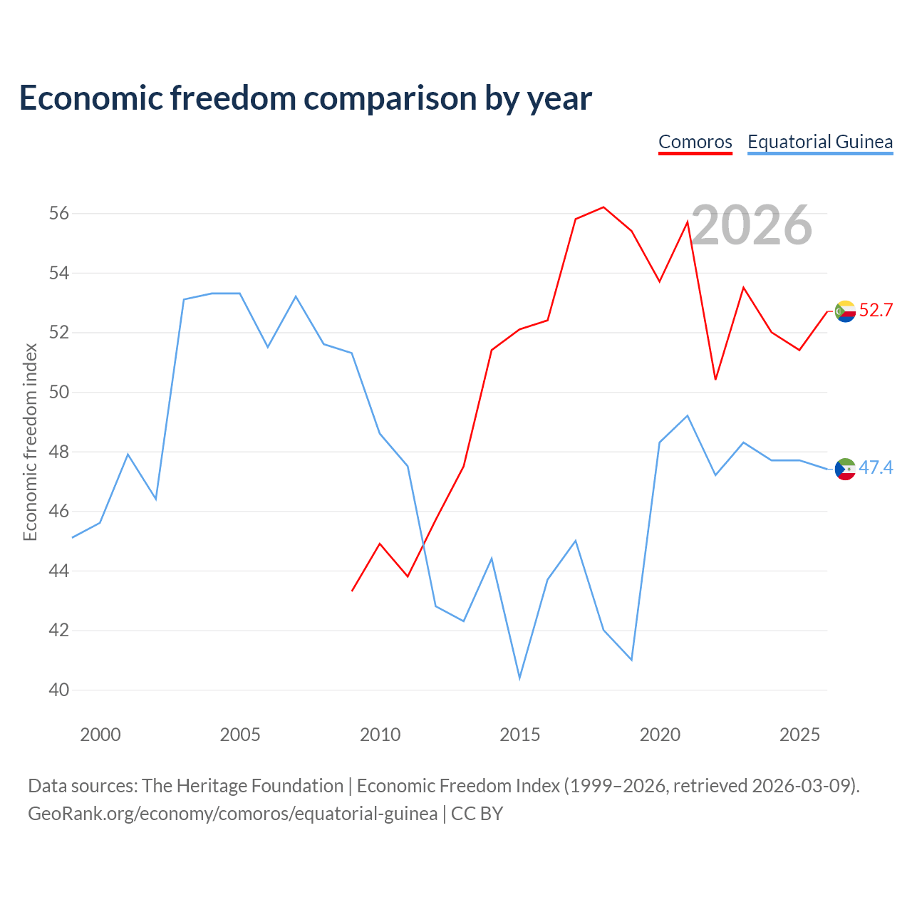 The Economic Freedom Index for Comoros is 52.7, ranking 145/197, compared to 47.4 for Equatorial Guinea, ranking 175/197. The chart above displays a comparison of annual changes in economic freedom indexes.