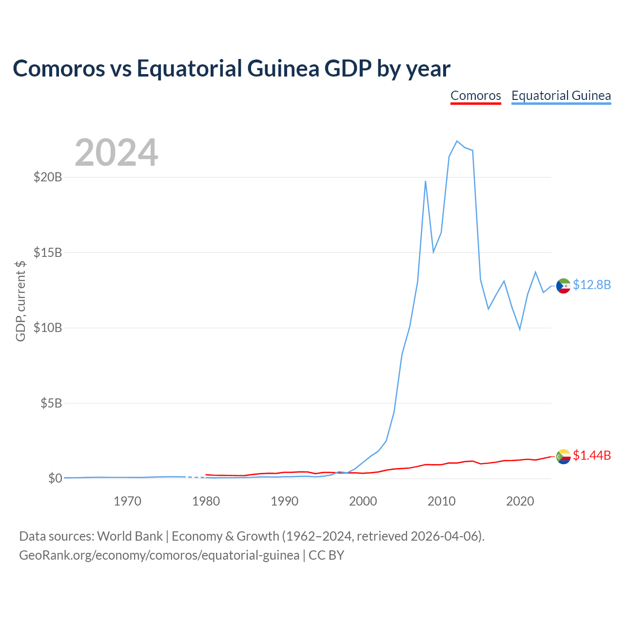 Comoros has a GDP of $1.44B compared to $12.8B for Equatorial Guinea, ranking 183/197 and 148/197 by economy size, respectively.