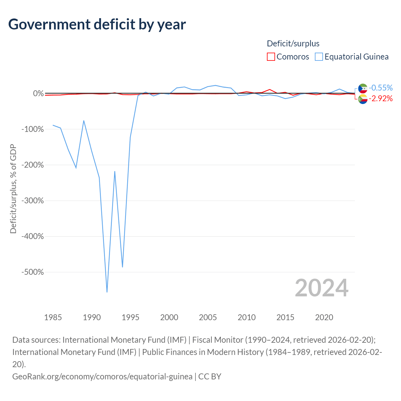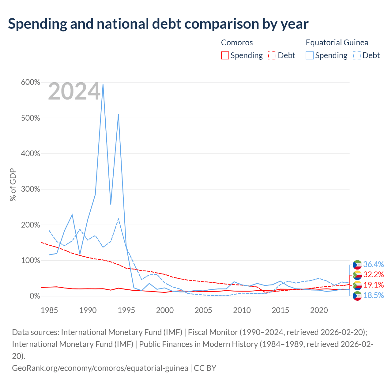 Comoros has $463M in government debt (32.2% of GDP), compared to $4.65B (36.4% of GDP) in Equatorial Guinea.