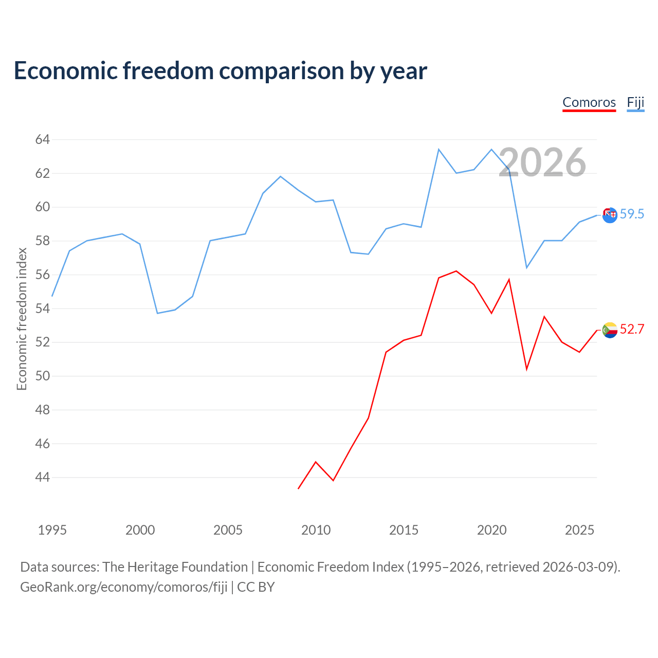 The Economic Freedom Index for Comoros is 52.7, ranking 145/197, compared to 59.5 for Fiji, ranking 103/197. The chart above displays a comparison of annual changes in economic freedom indexes.