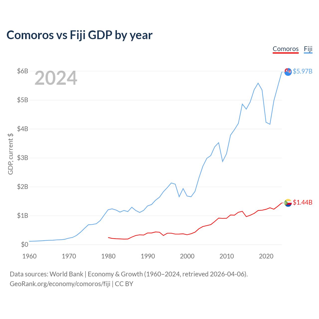 Comoros has a GDP of $1.44B compared to $5.97B for Fiji, ranking 183/197 and 161/197 by economy size, respectively.