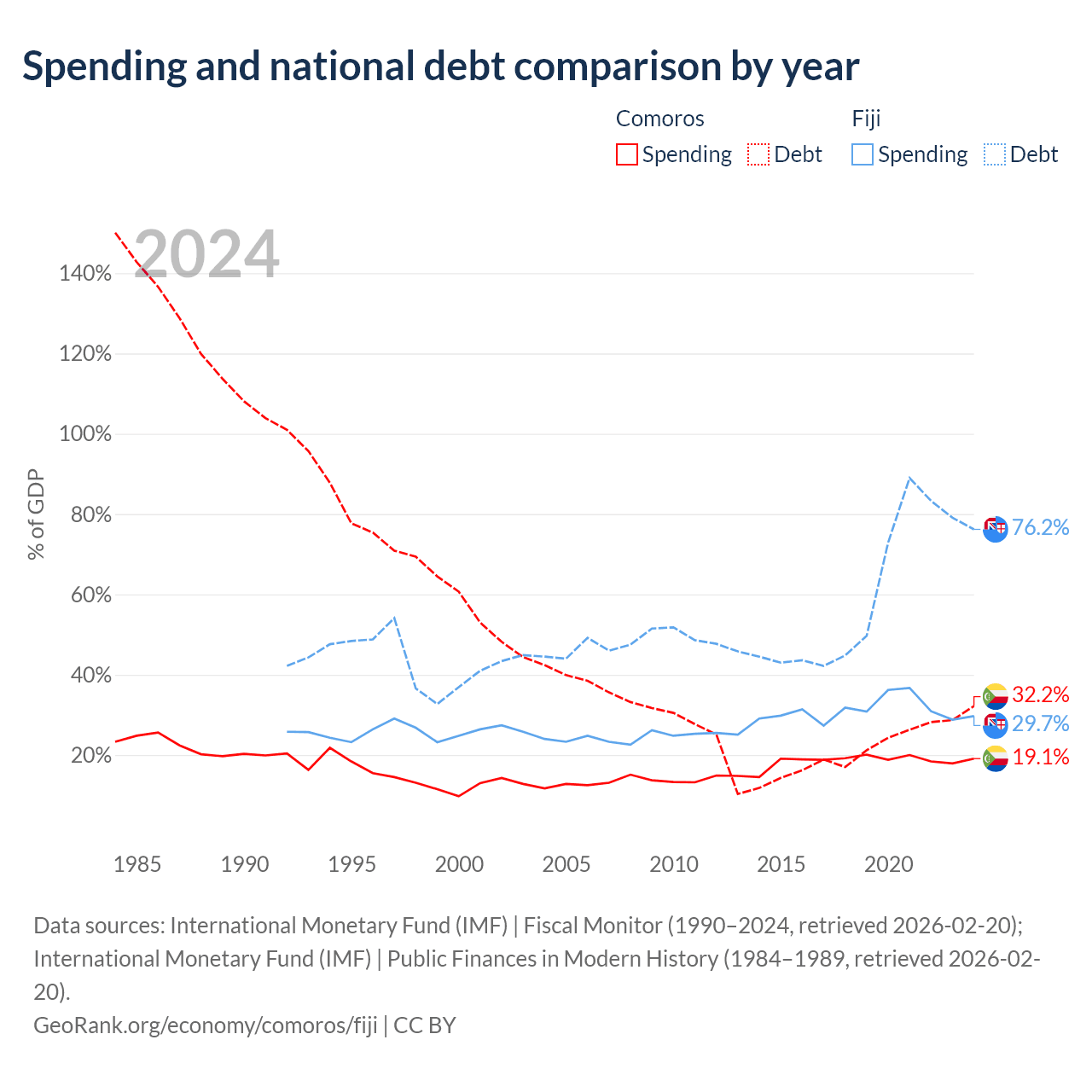 Comoros has $463M in government debt (32.2% of GDP), compared to $4.54B (76.2% of GDP) in Fiji.