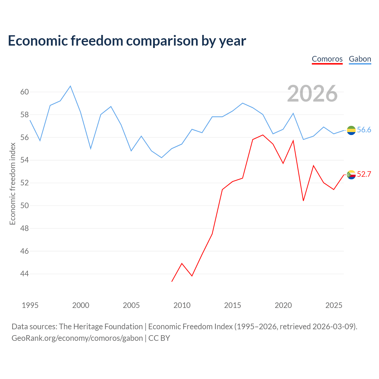 The Economic Freedom Index for Comoros is 52.7, ranking 145/197, compared to 56.6 for Gabon, ranking 120/197. The chart above displays a comparison of annual changes in economic freedom indexes.