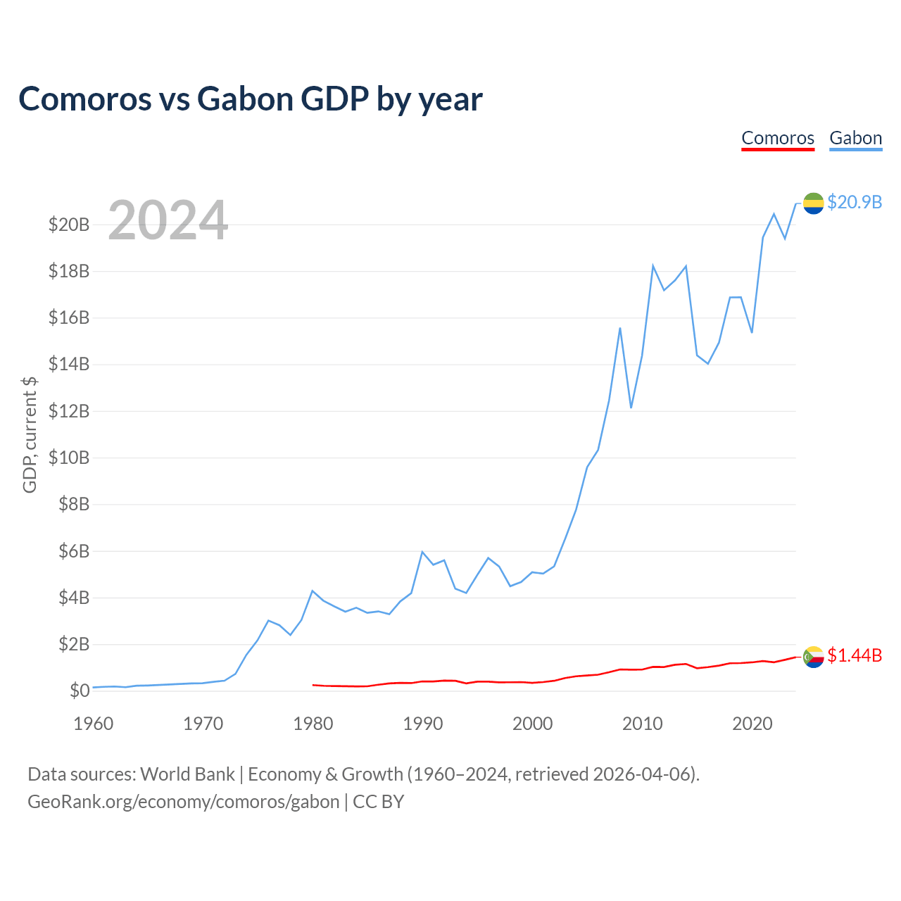 Comoros has a GDP of $1.44B compared to $20.9B for Gabon, ranking 183/197 and 127/197 by economy size, respectively.