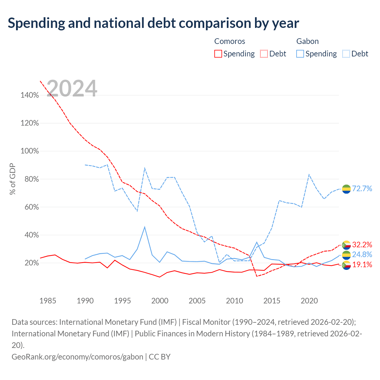 Comoros has $463M in government debt (32.2% of GDP), compared to $15.2B (72.7% of GDP) in Gabon.