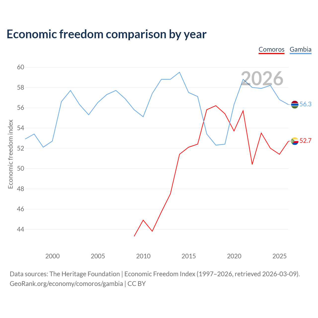 The Economic Freedom Index for Comoros is 52.7, ranking 145/197, compared to 56.3 for the Gambia, ranking 123/197. The chart above displays a comparison of annual changes in economic freedom indexes.