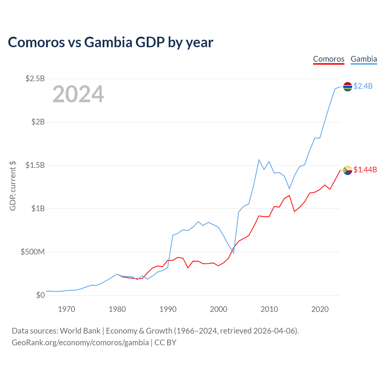 Comoros has a GDP of $1.44B compared to $2.4B for the Gambia, ranking 183/197 and 174/197 by economy size, respectively.