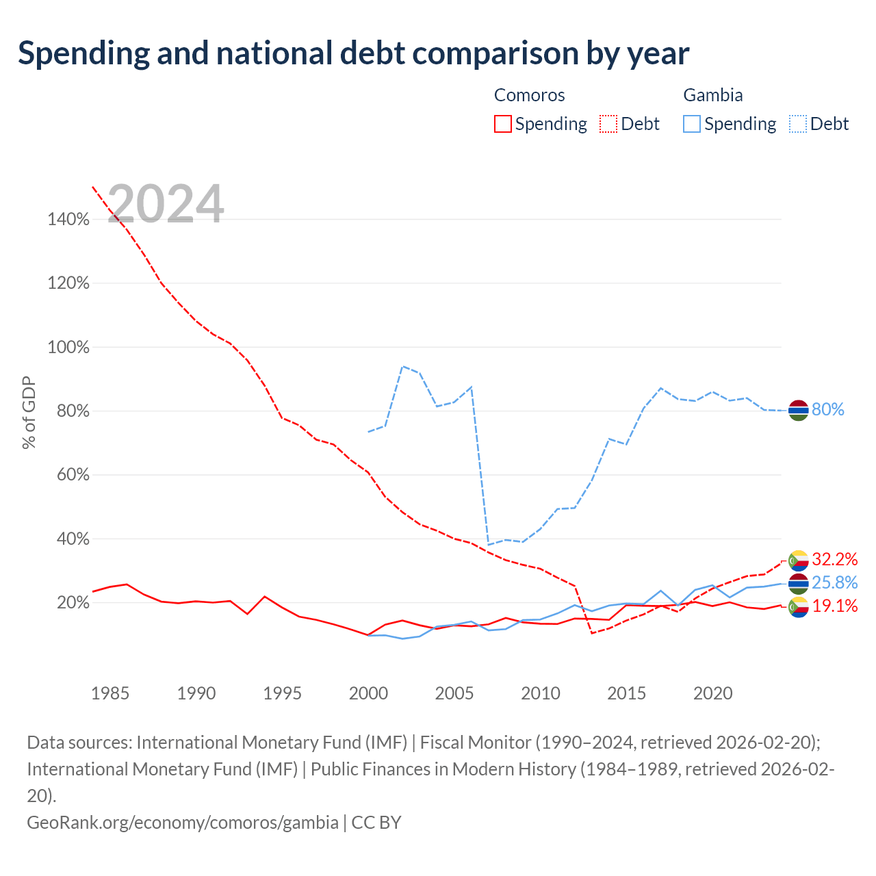 Comoros has $463M in government debt (32.2% of GDP), compared to $1.92B (80% of GDP) in the Gambia.
