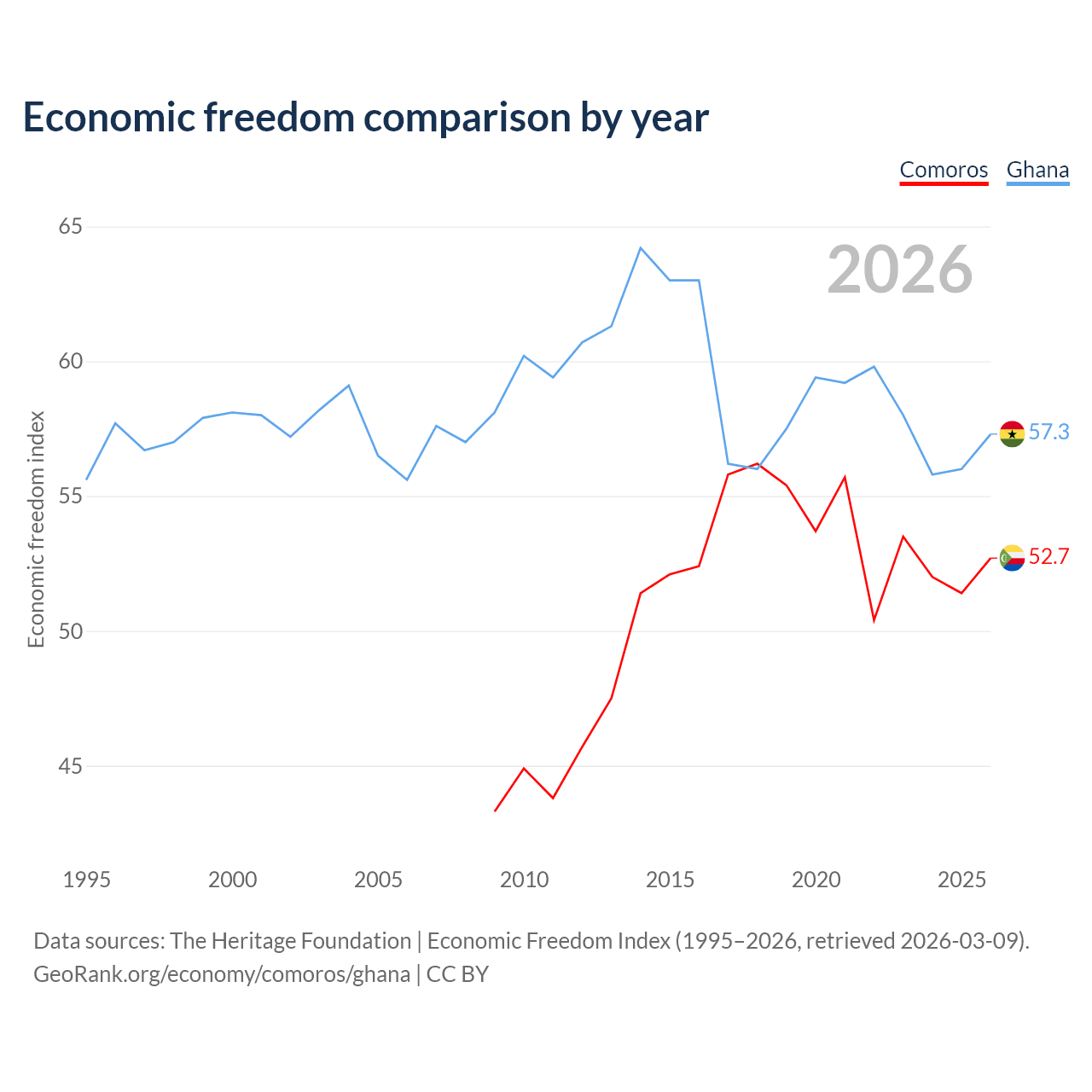The Economic Freedom Index for Comoros is 52.7, ranking 145/197, compared to 57.3 for Ghana, ranking 118/197. The chart above displays a comparison of annual changes in economic freedom indexes.
