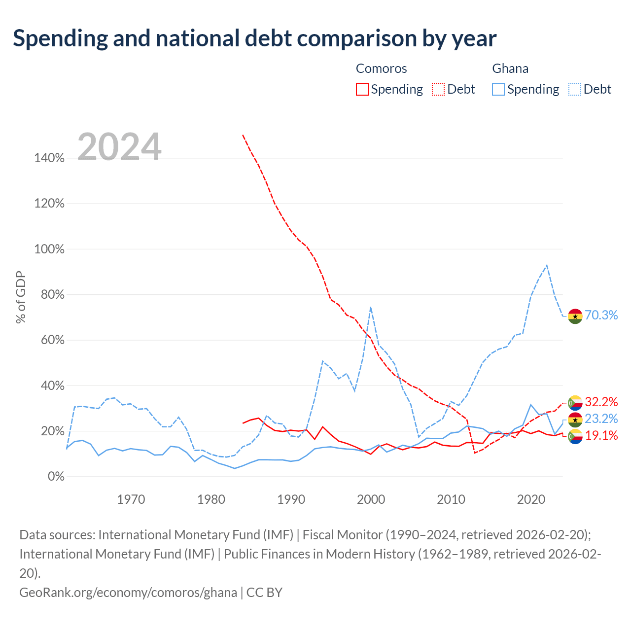 Comoros has $463M in government debt (32.2% of GDP), compared to $57.9B (70.3% of GDP) in Ghana.
