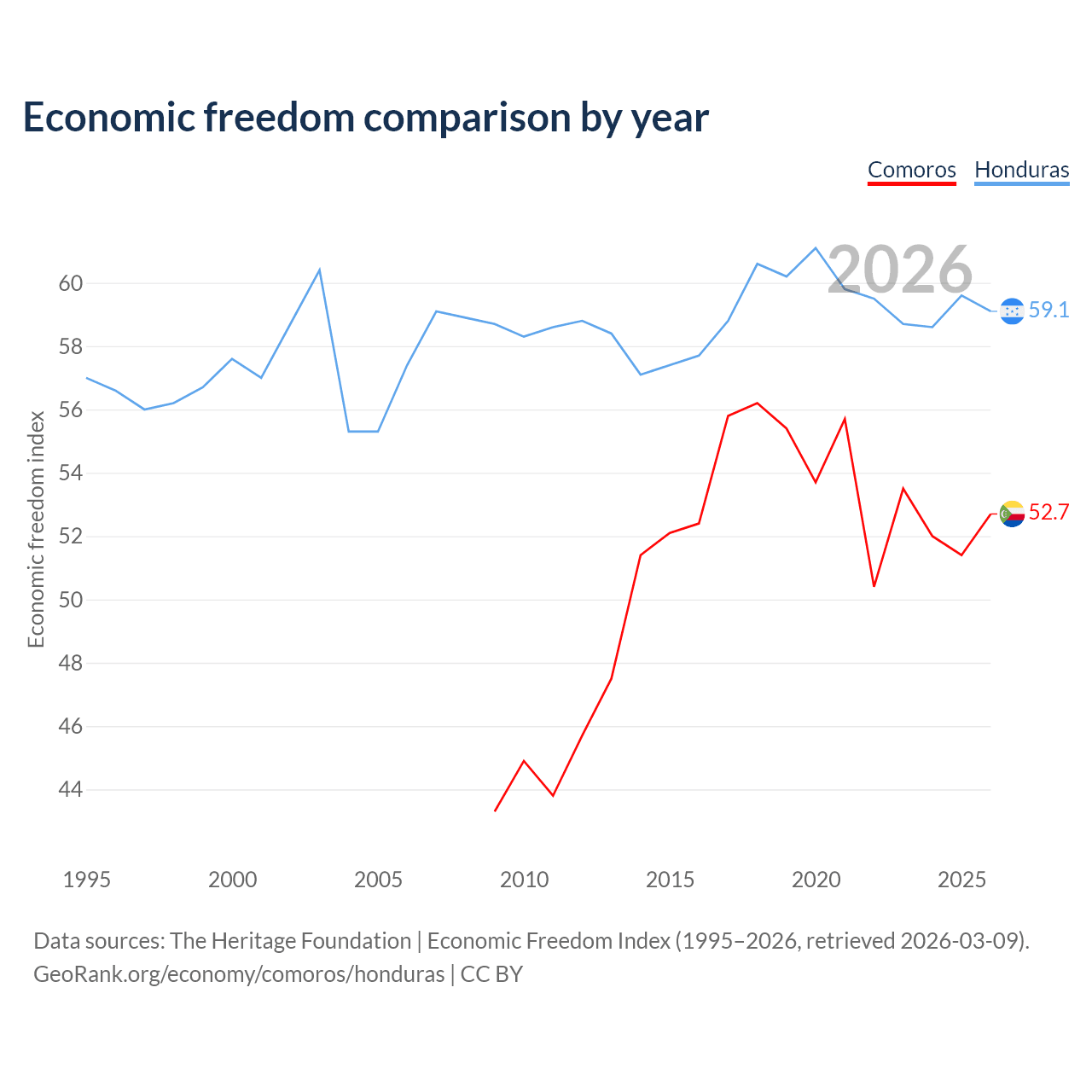The Economic Freedom Index for Comoros is 52.7, ranking 145/197, compared to 59.1 for Honduras, ranking 105/197. The chart above displays a comparison of annual changes in economic freedom indexes.