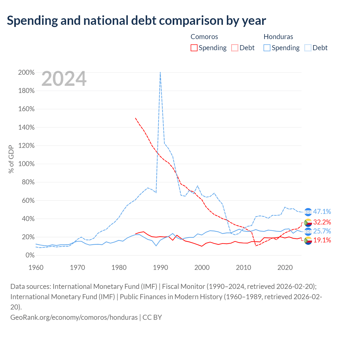 Comoros has $463M in government debt (32.2% of GDP), compared to $17.5B (47.1% of GDP) in Honduras.