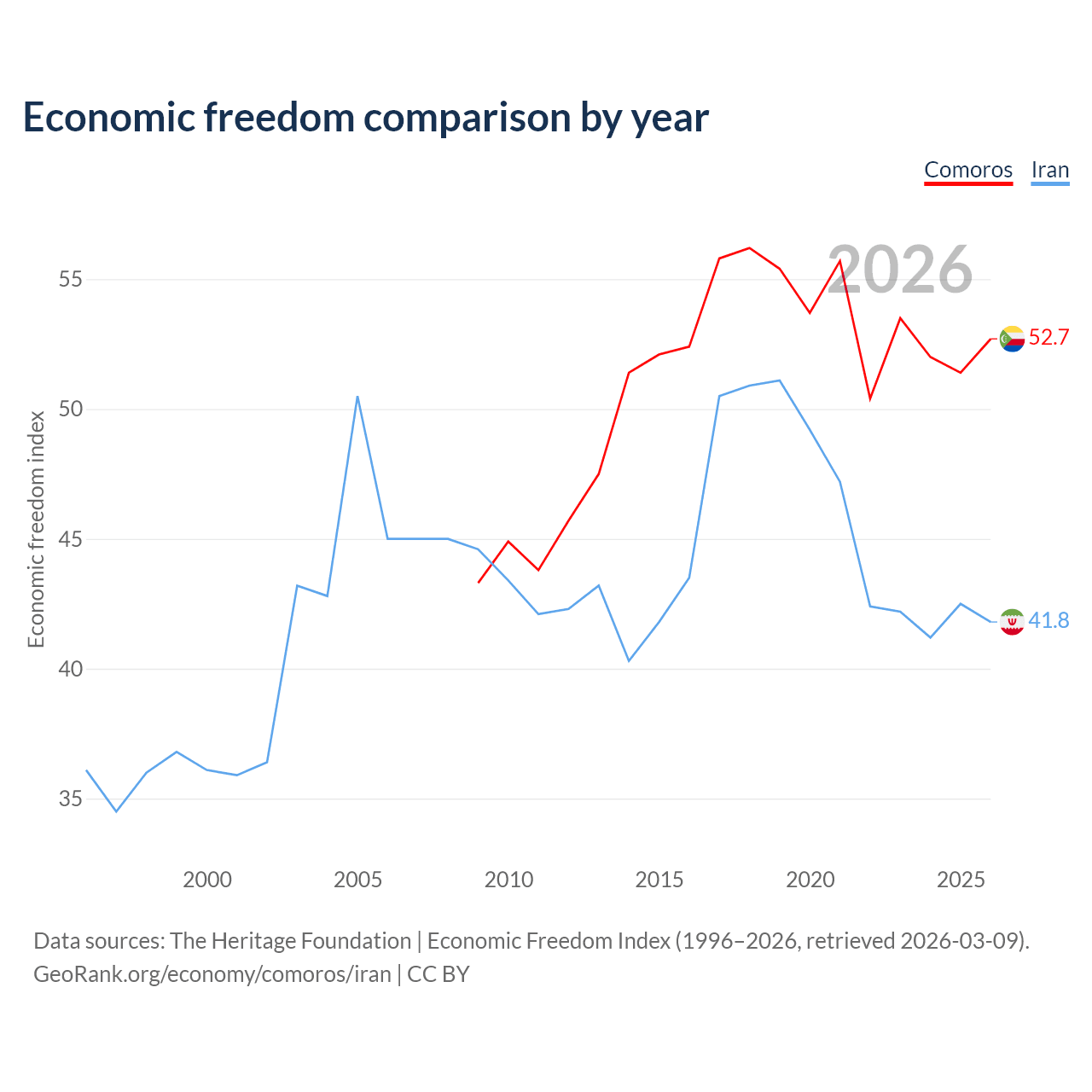 The Economic Freedom Index for Comoros is 52.7, ranking 145/197, compared to 41.8 for Iran, ranking 185/197. The chart above displays a comparison of annual changes in economic freedom indexes.