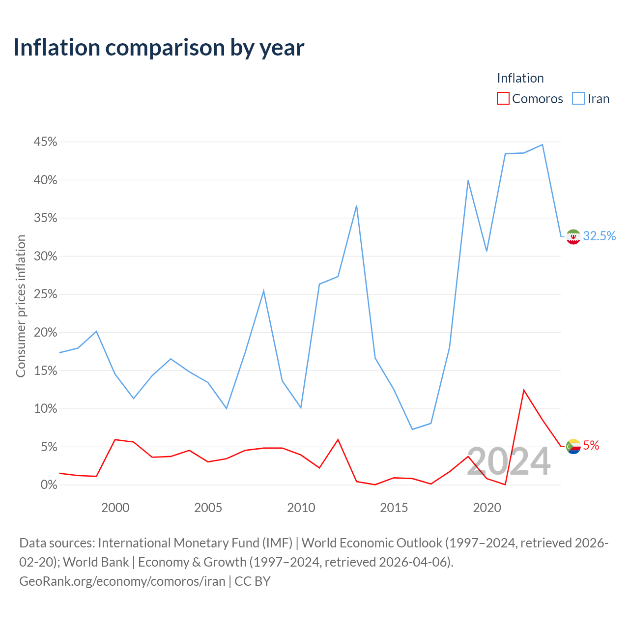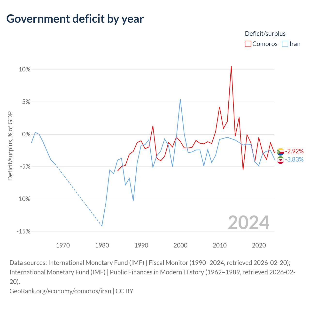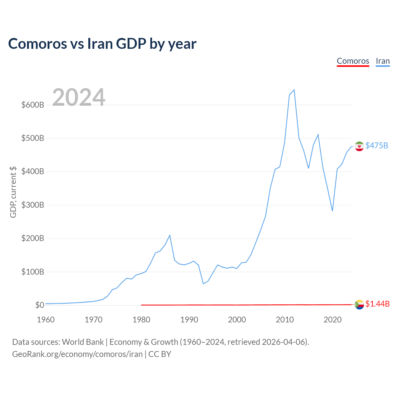 Comoros has a GDP of $1.44B compared to $475B for Iran, ranking 183/197 and 34/197 by economy size, respectively.