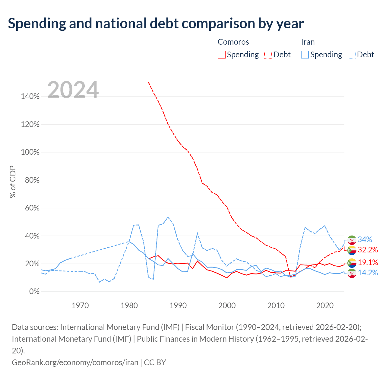 Comoros has $463M in government debt (32.2% of GDP), compared to $162B (34% of GDP) in Iran.