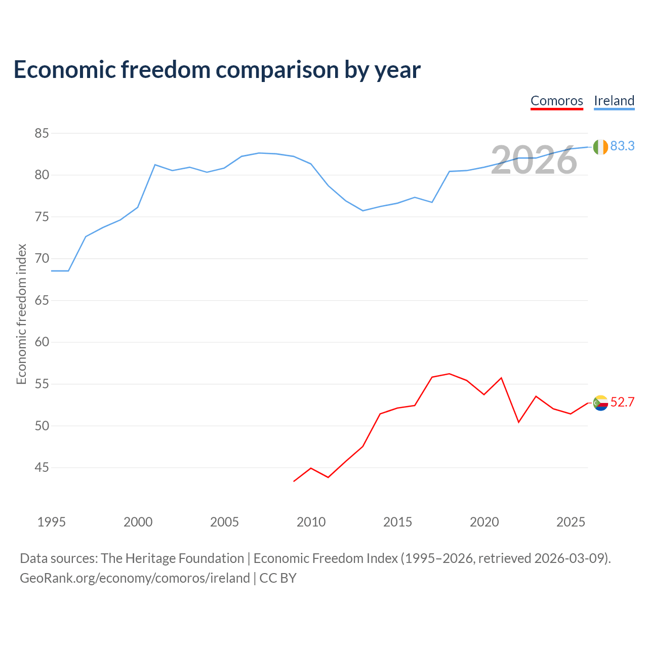 The Economic Freedom Index for Comoros is 52.7, ranking 145/197, compared to 83.3 for Ireland, ranking 3/197. The chart above displays a comparison of annual changes in economic freedom indexes.