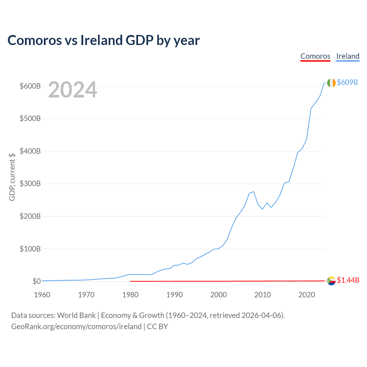 Comoros has a GDP of $1.44B compared to $609B for Ireland, ranking 183/197 and 25/197 by economy size, respectively.