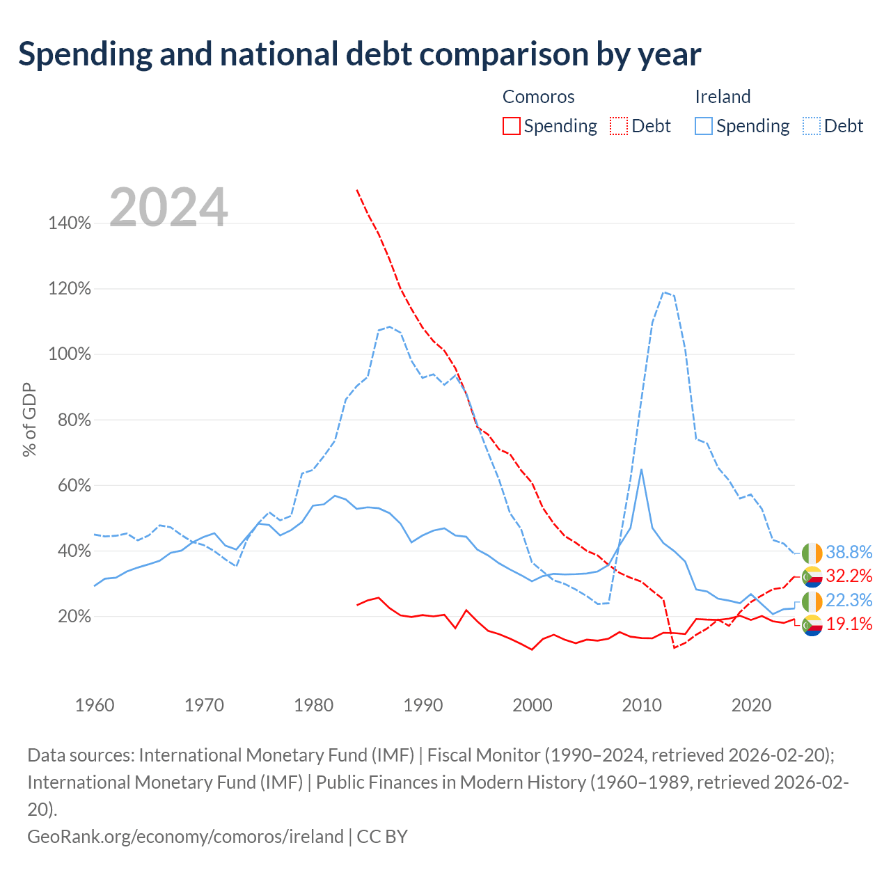 Comoros has $463M in government debt (32.2% of GDP), compared to $236B (38.8% of GDP) in Ireland.