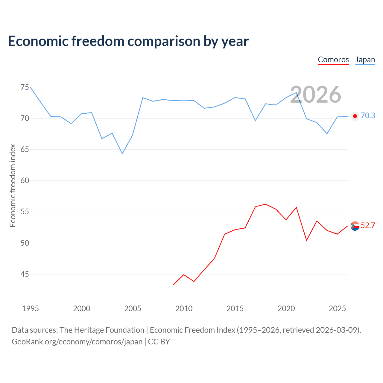 The Economic Freedom Index for Comoros is 52.7, ranking 145/197, compared to 70.3 for Japan, ranking 36/197. The chart above displays a comparison of annual changes in economic freedom indexes.