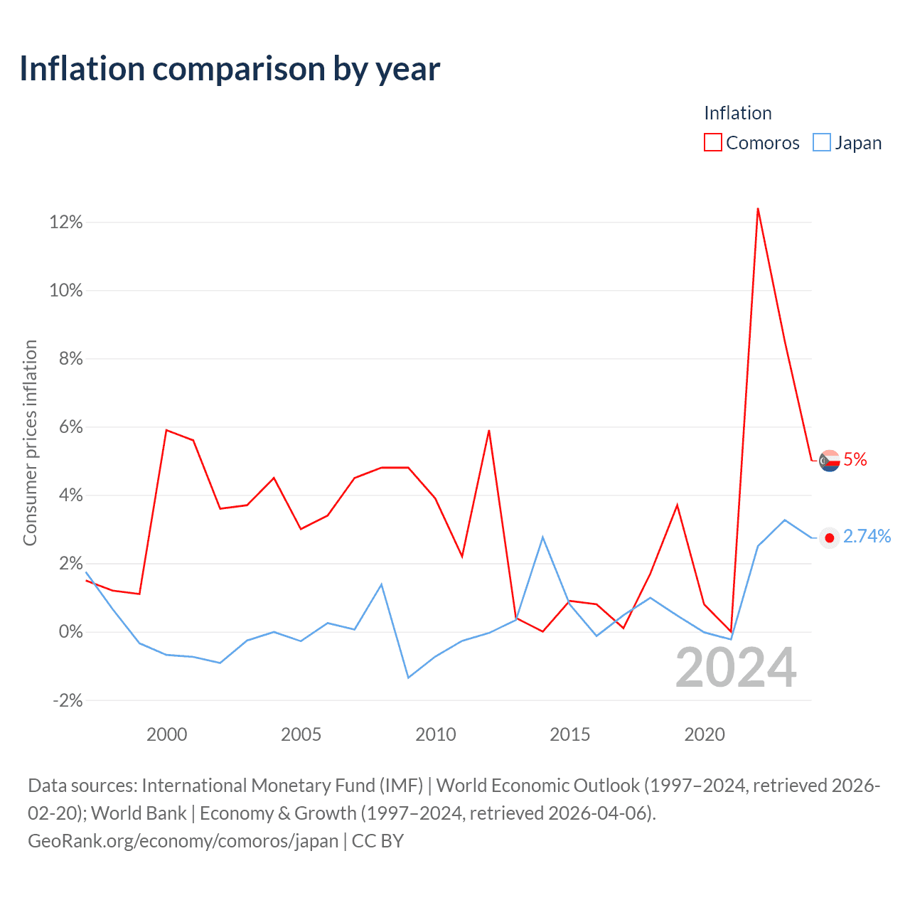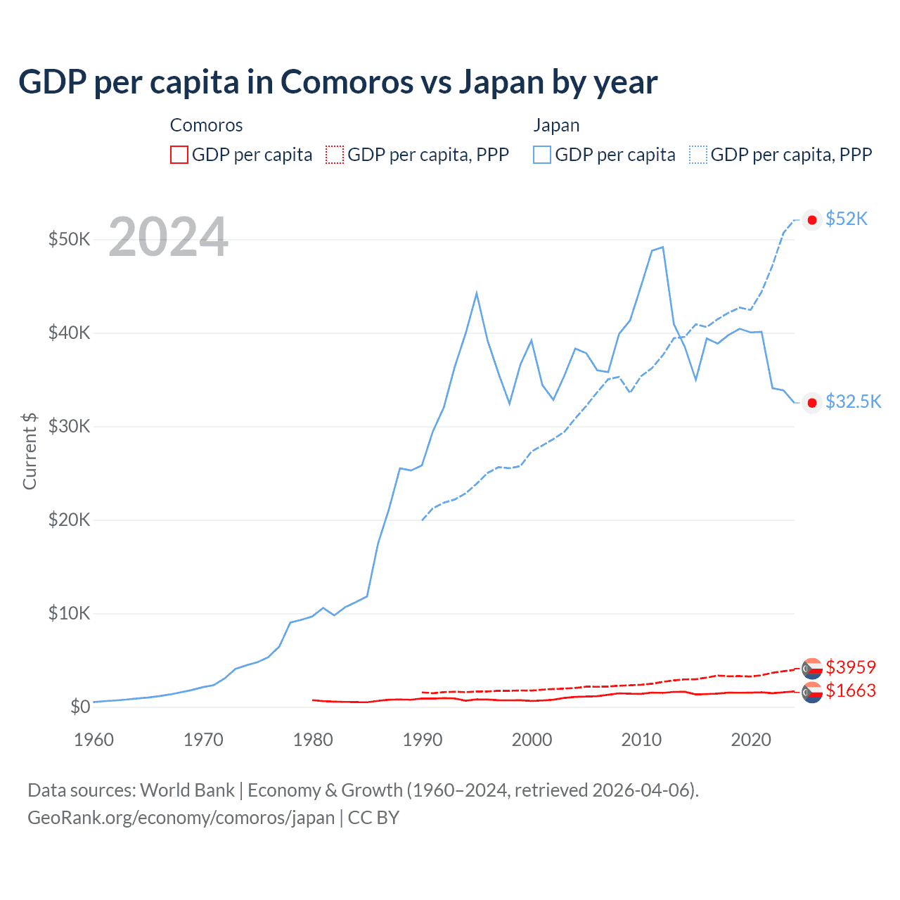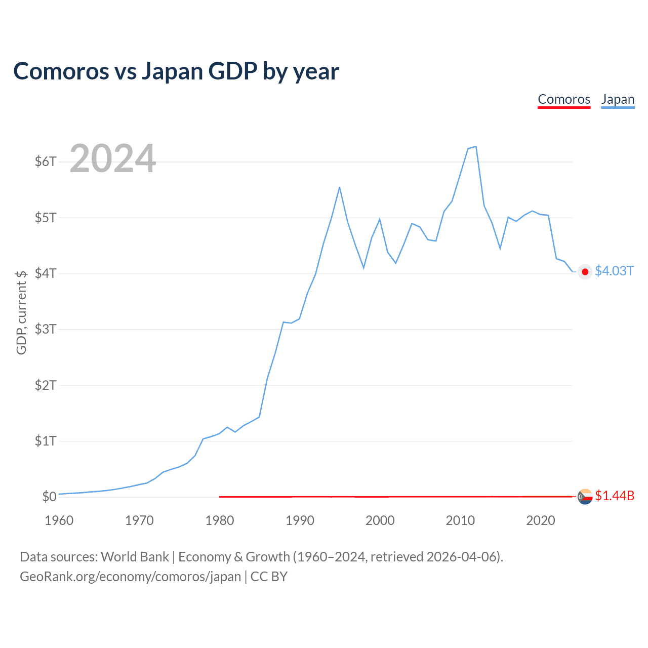 Comoros has a GDP of $1.44B compared to $4.03T for Japan, ranking 183/197 and 4/197 by economy size, respectively.