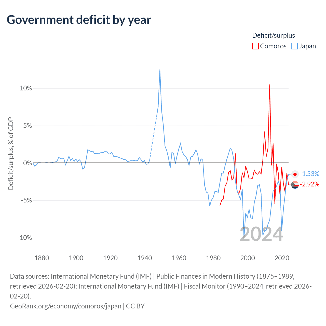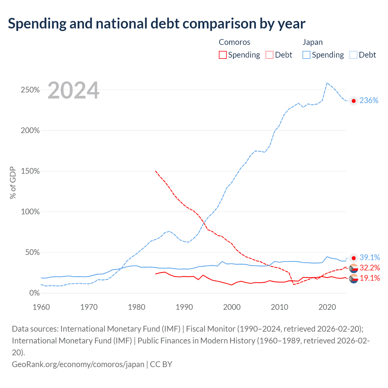 Comoros has $463M in government debt (32.2% of GDP), compared to $9.51T (236.1% of GDP) in Japan.