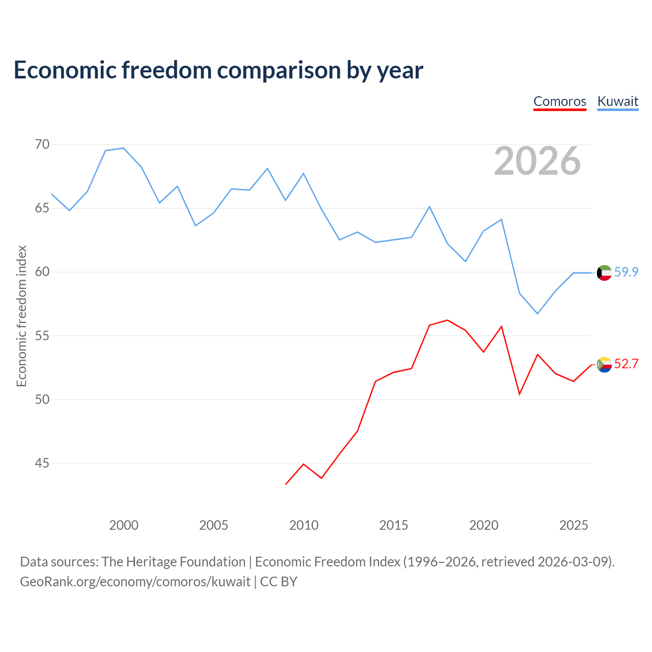 The Economic Freedom Index for Comoros is 52.7, ranking 145/197, compared to 59.9 for Kuwait, ranking 100/197. The chart above displays a comparison of annual changes in economic freedom indexes.