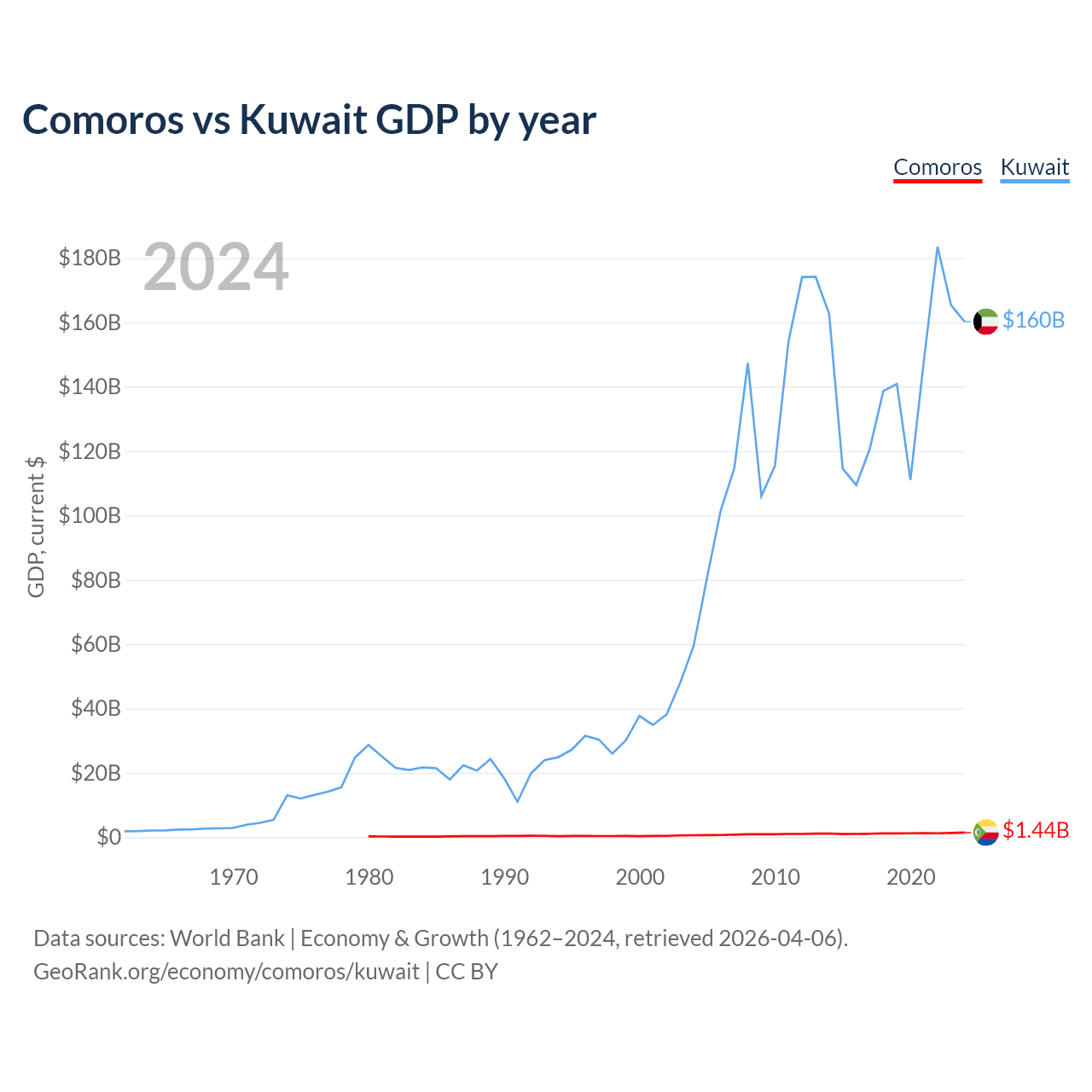 Comoros has a GDP of $1.44B compared to $160B for Kuwait, ranking 183/197 and 59/197 by economy size, respectively.