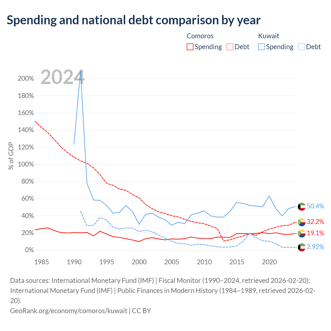 Comoros has $463M in government debt (32.2% of GDP), compared to $4.68B (2.92% of GDP) in Kuwait.
