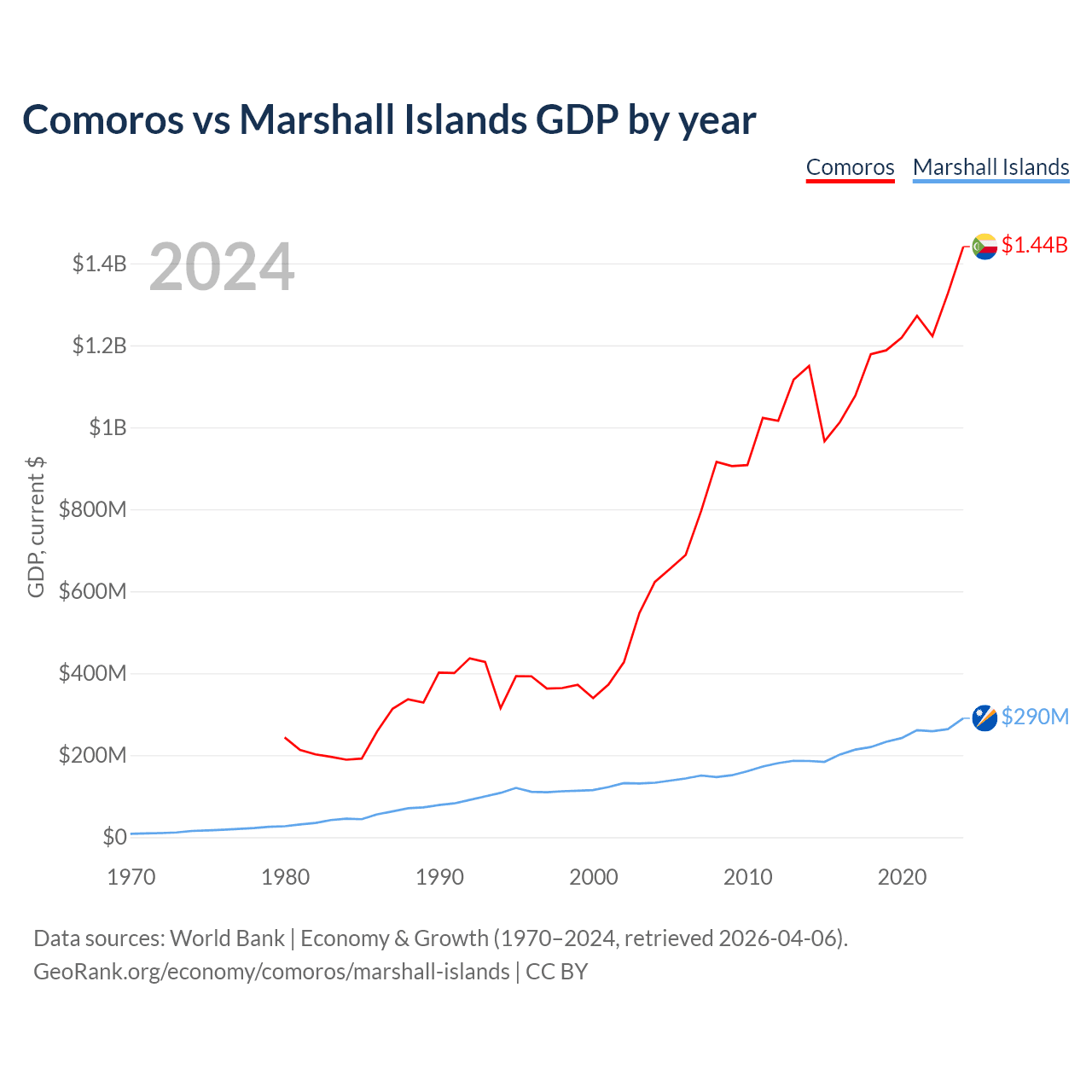 Comoros has a GDP of $1.44B compared to $290M for the Marshall Islands, ranking 183/197 and 193/197 by economy size, respectively.