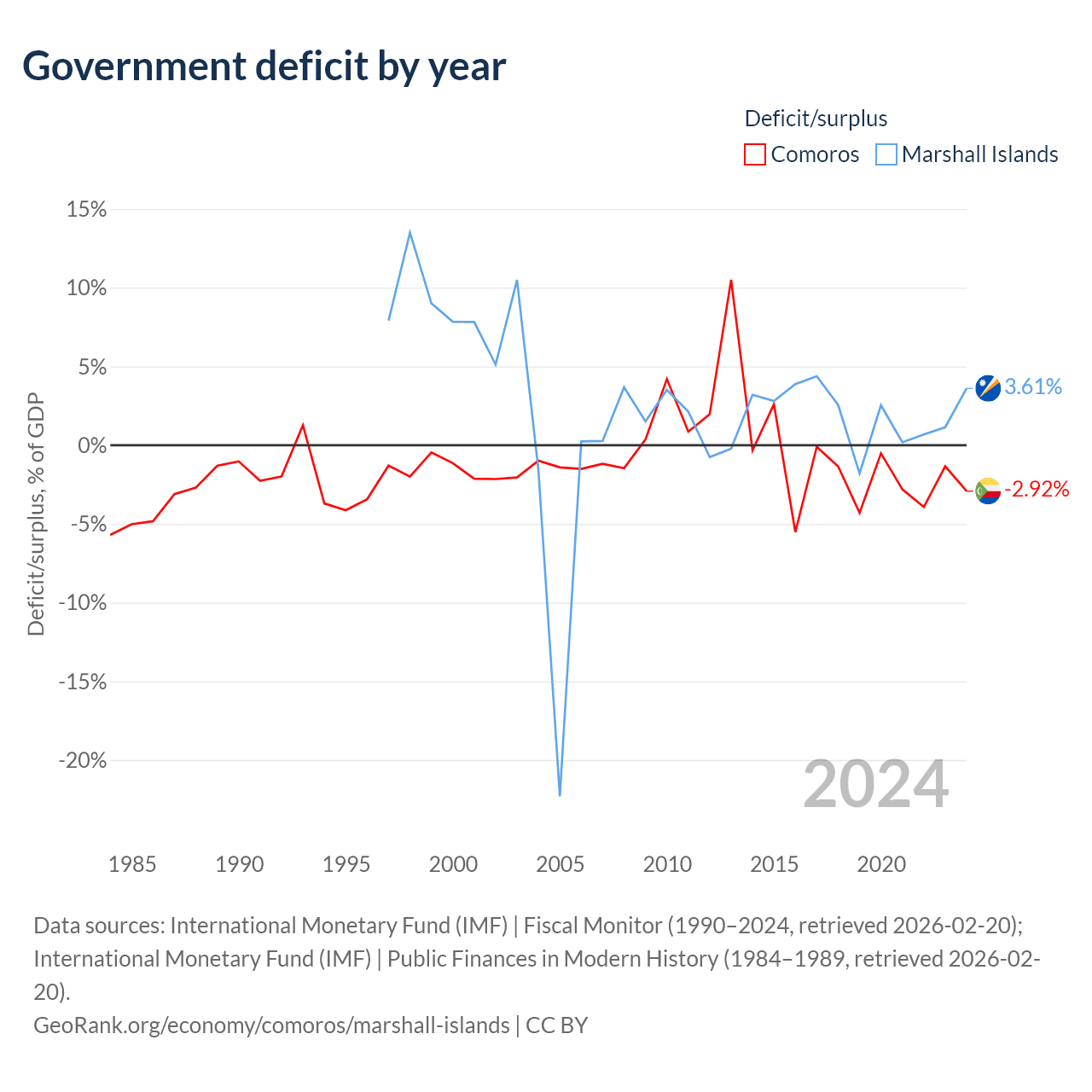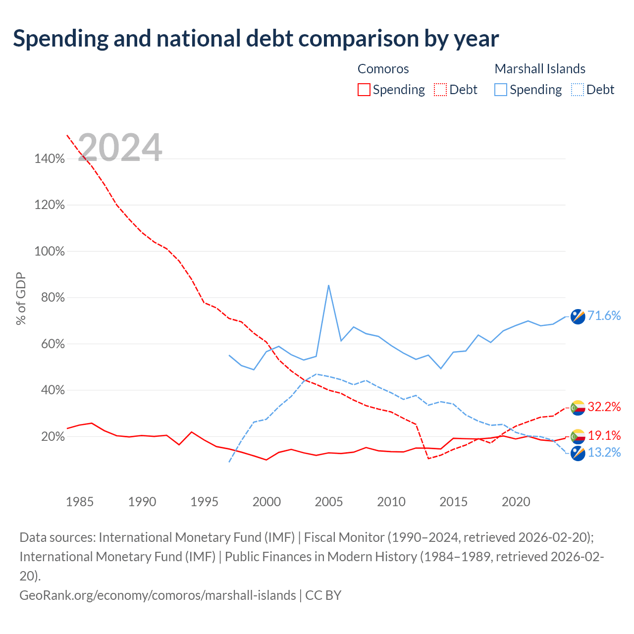 Comoros has $463M in government debt (32.2% of GDP), compared to $38.4M (13.2% of GDP) in the Marshall Islands.