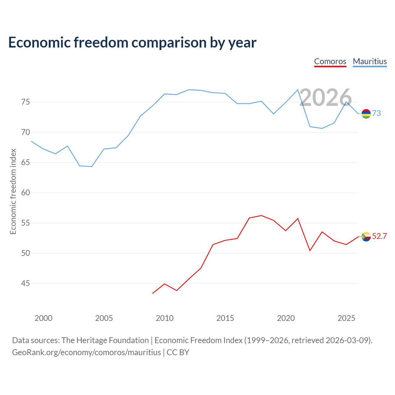 The Economic Freedom Index for Comoros is 52.7, ranking 145/197, compared to 73 for Mauritius, ranking 26/197. The chart above displays a comparison of annual changes in economic freedom indexes.