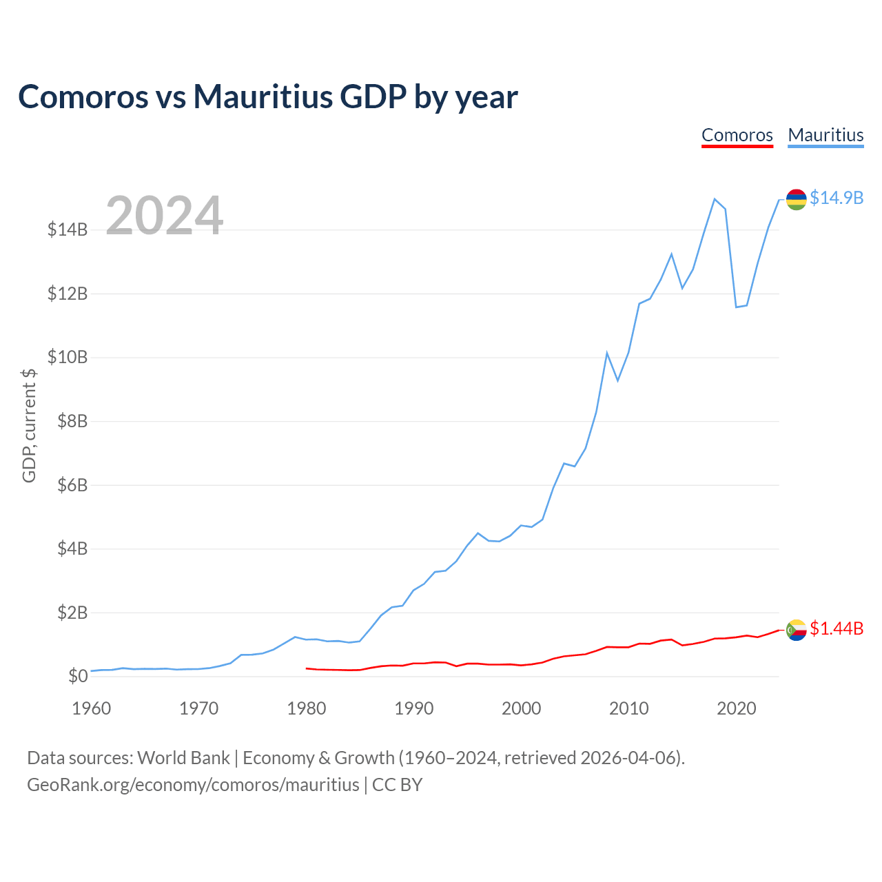 Comoros has a GDP of $1.44B compared to $14.9B for Mauritius, ranking 183/197 and 143/197 by economy size, respectively.