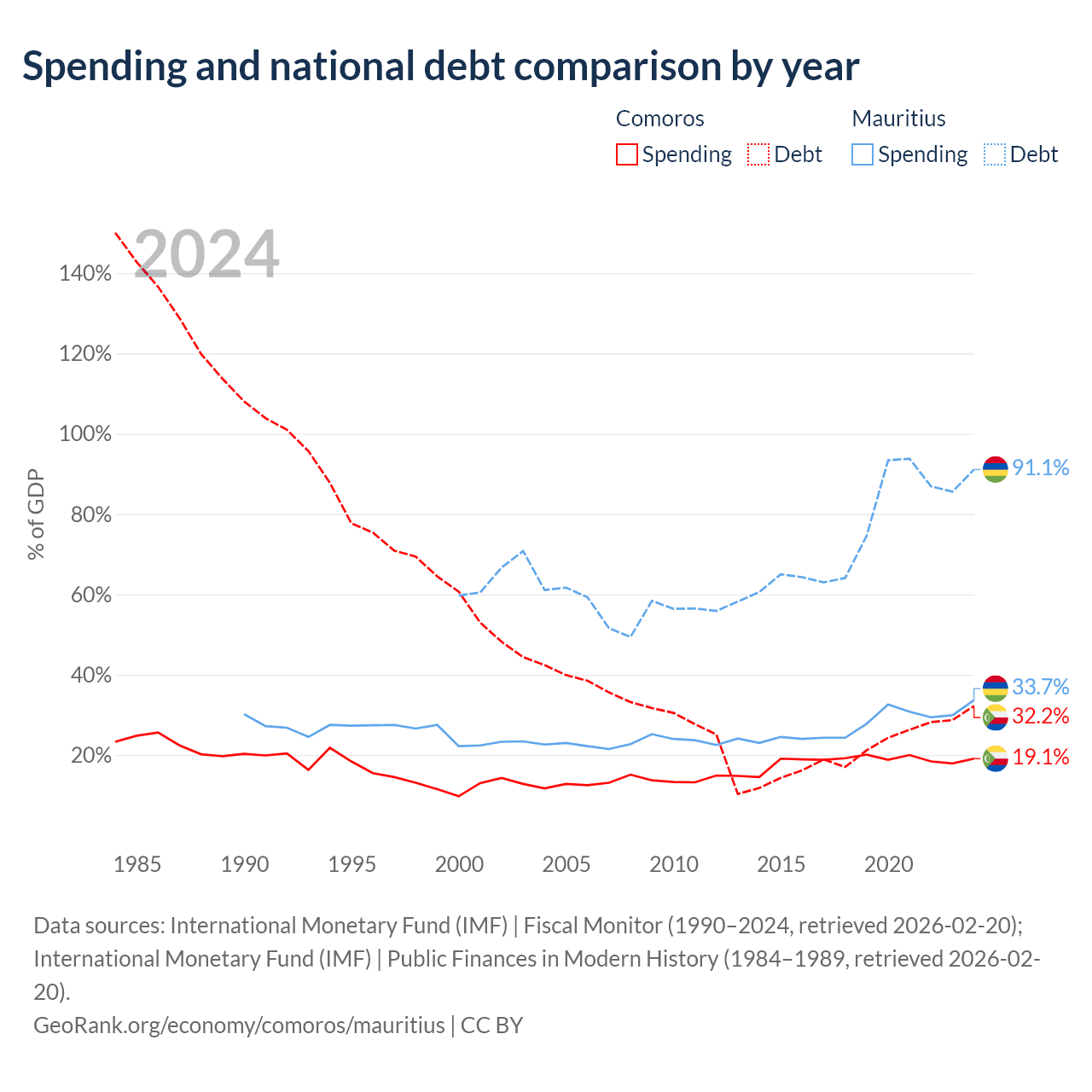 Comoros has $463M in government debt (32.2% of GDP), compared to $13.6B (91.1% of GDP) in Mauritius.