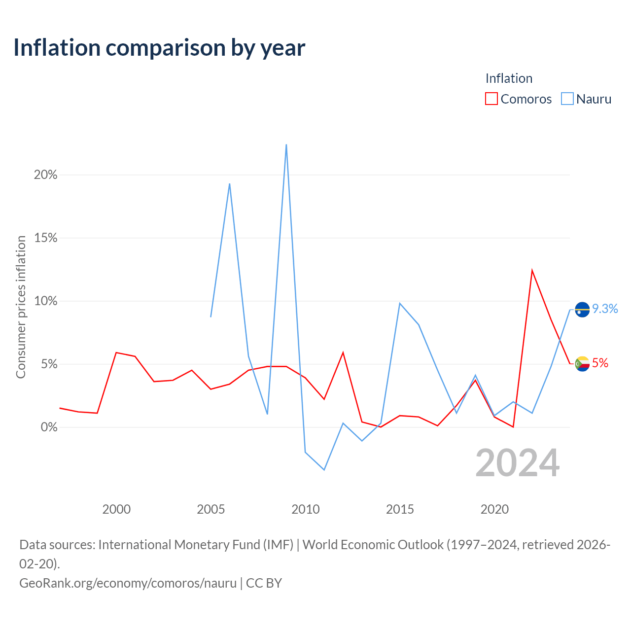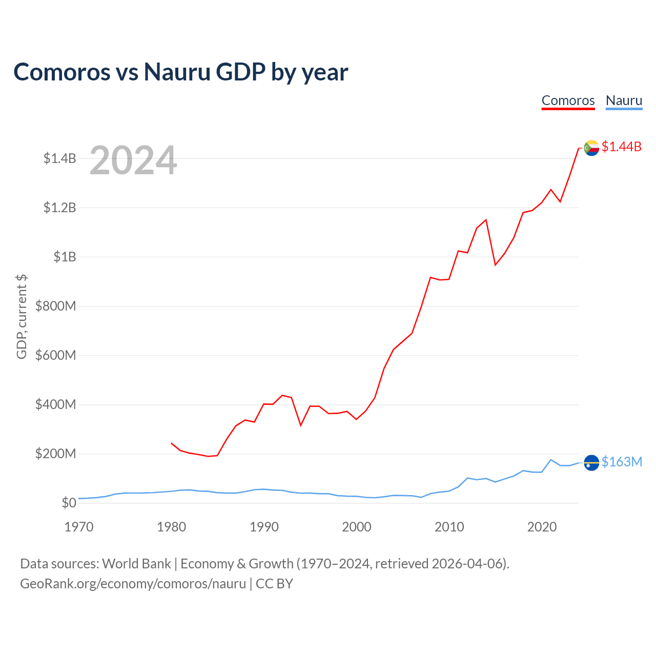 Comoros has a GDP of $1.44B compared to $163M for Nauru, ranking 183/197 and 195/197 by economy size, respectively.
