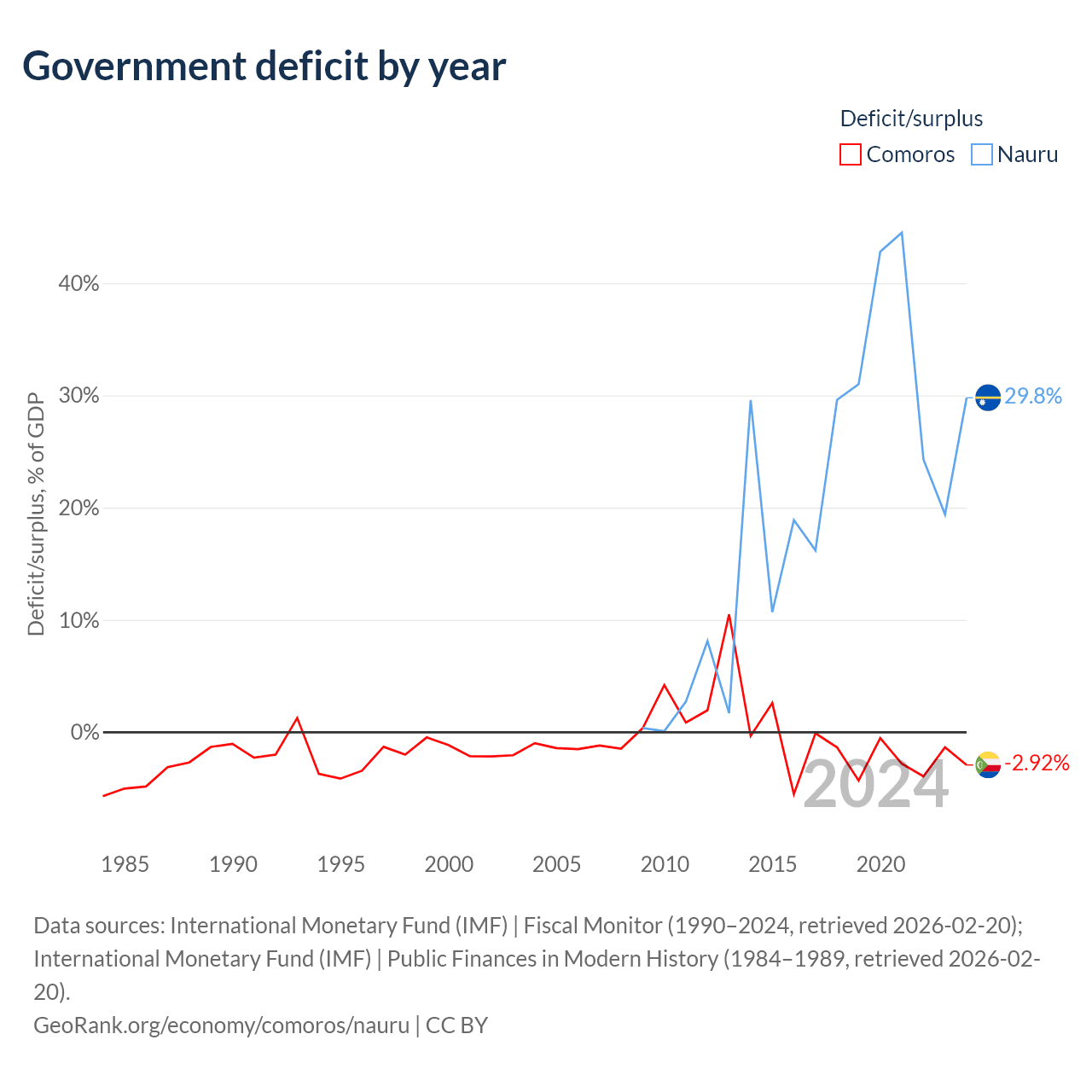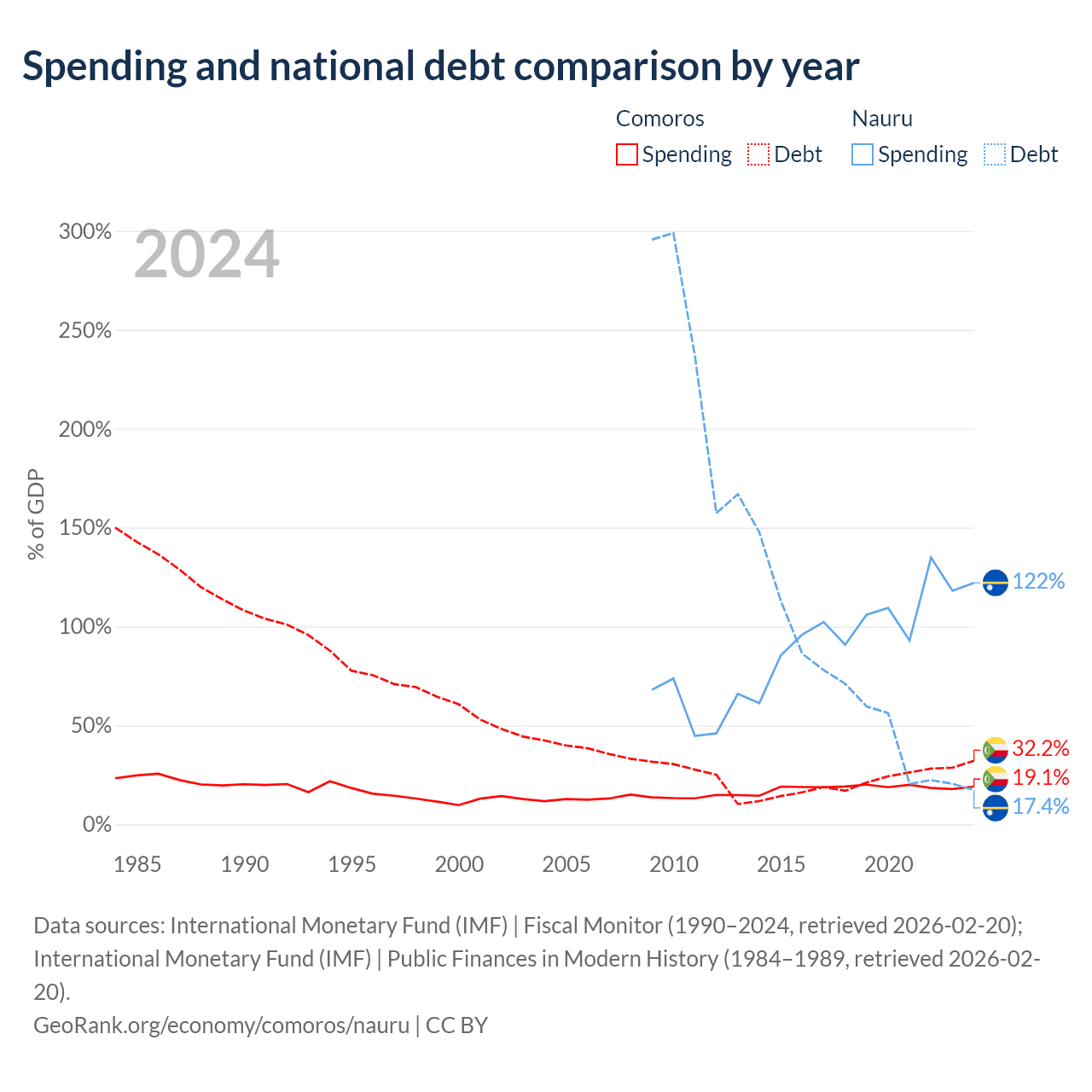 Comoros has $463M in government debt (32.2% of GDP), compared to $28.3M (17.4% of GDP) in Nauru.