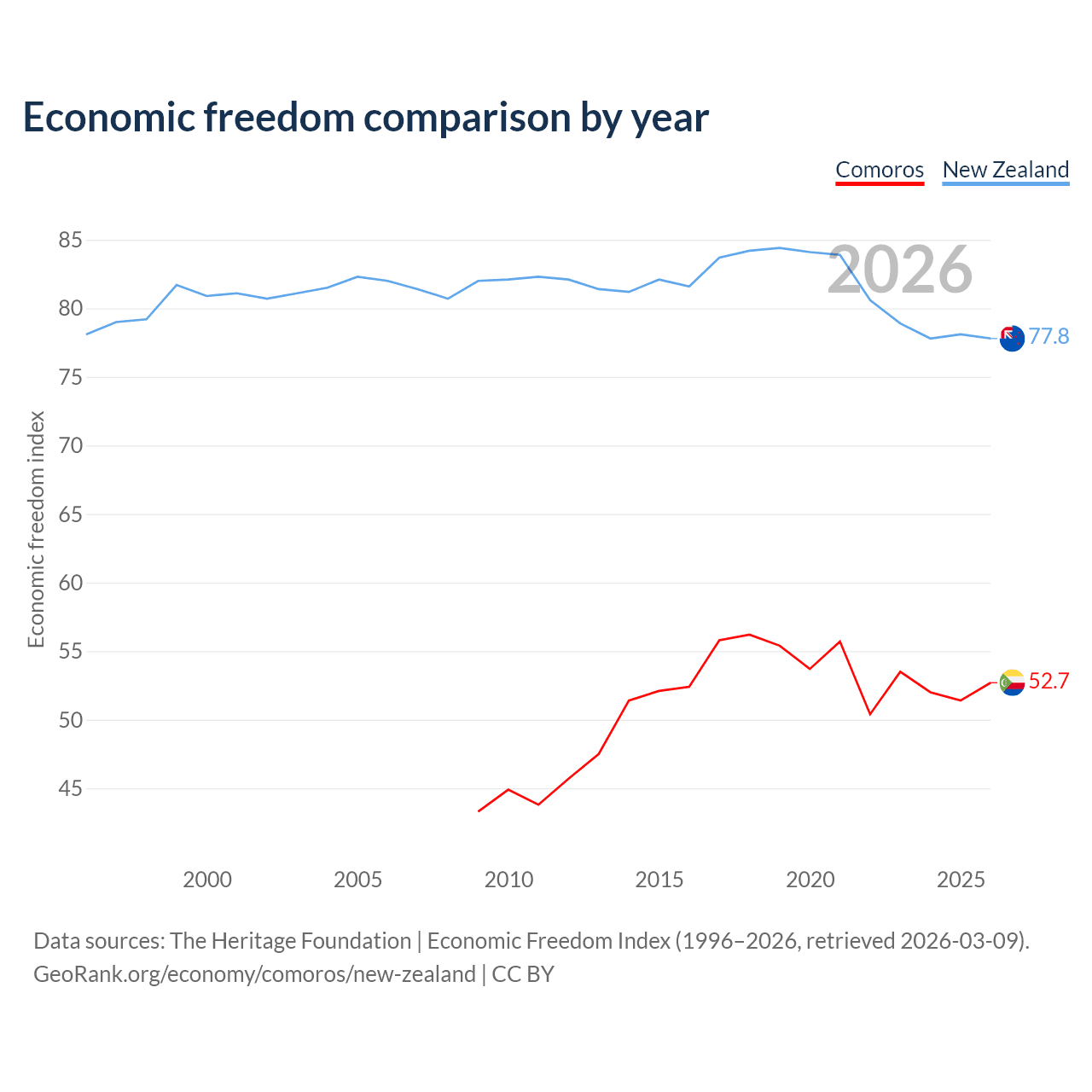 The Economic Freedom Index for Comoros is 52.7, ranking 145/197, compared to 77.8 for New Zealand, ranking 13/197. The chart above displays a comparison of annual changes in economic freedom indexes.