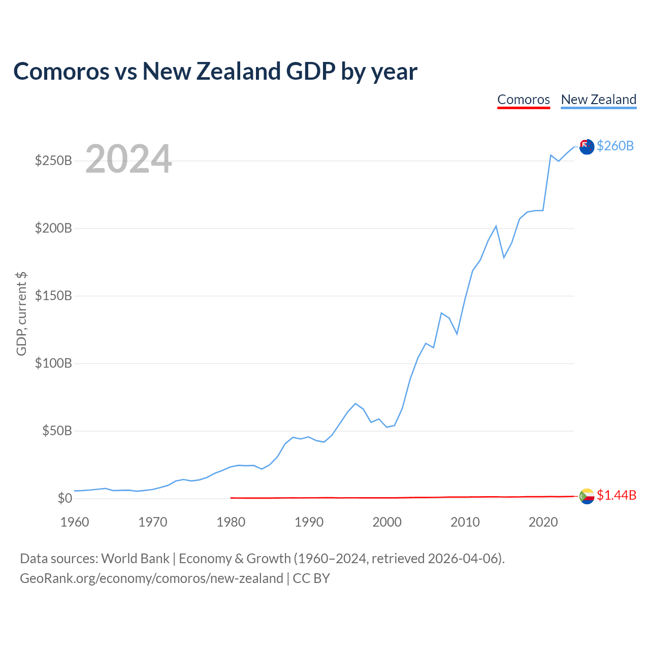 Comoros has a GDP of $1.44B compared to $260B for New Zealand, ranking 183/197 and 52/197 by economy size, respectively.