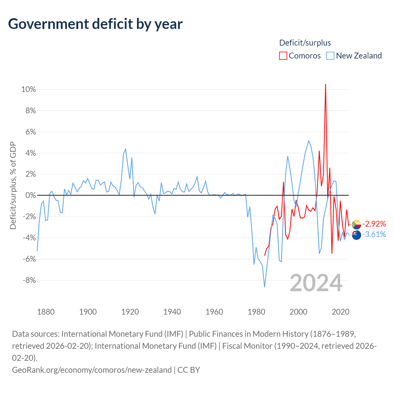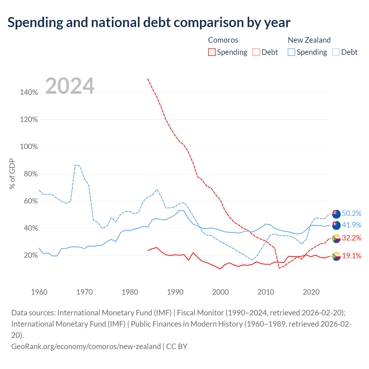 Comoros has $463M in government debt (32.2% of GDP), compared to $131B (50.2% of GDP) in New Zealand.