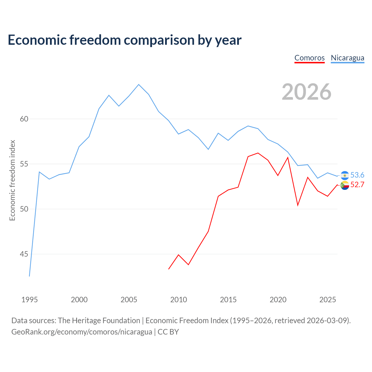 The Economic Freedom Index for Comoros is 52.7, ranking 145/197, compared to 53.6 for Nicaragua, ranking 139/197. The chart above displays a comparison of annual changes in economic freedom indexes.