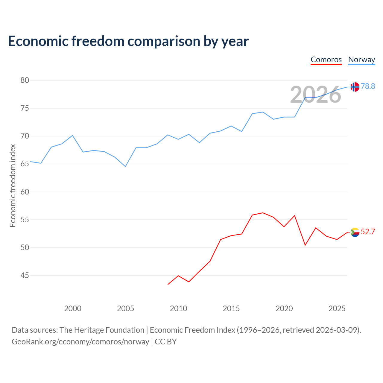 The Economic Freedom Index for Comoros is 52.7, ranking 145/197, compared to 78.8 for Norway, ranking 9/197. The chart above displays a comparison of annual changes in economic freedom indexes.