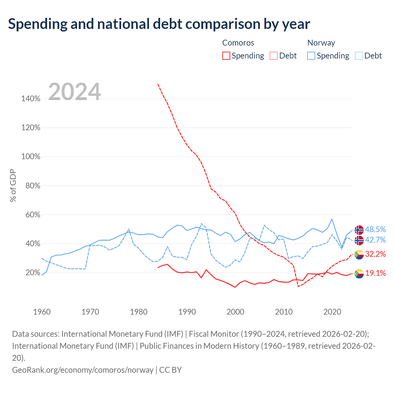 Comoros has $463M in government debt (32.2% of GDP), compared to $207B (42.7% of GDP) in Norway.
