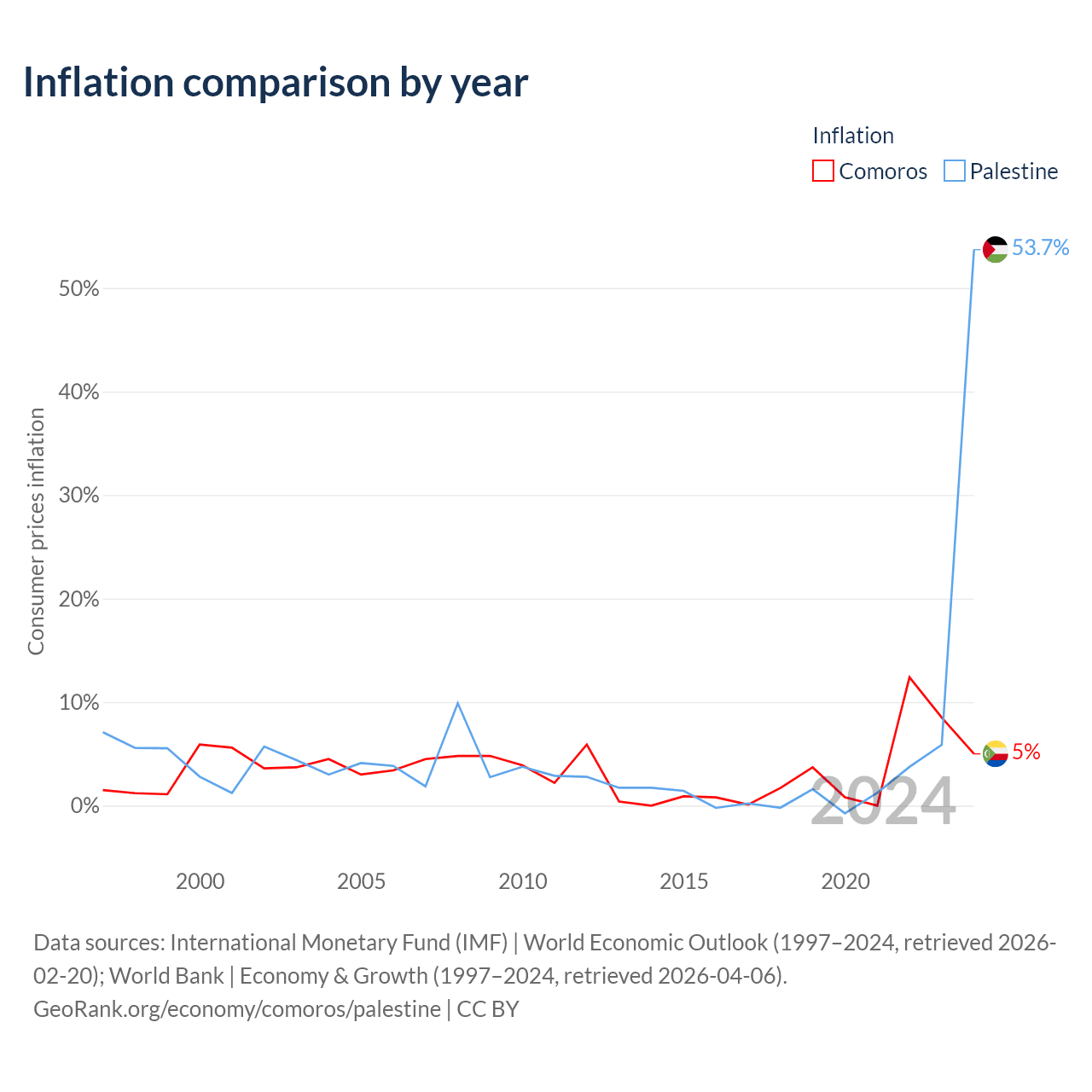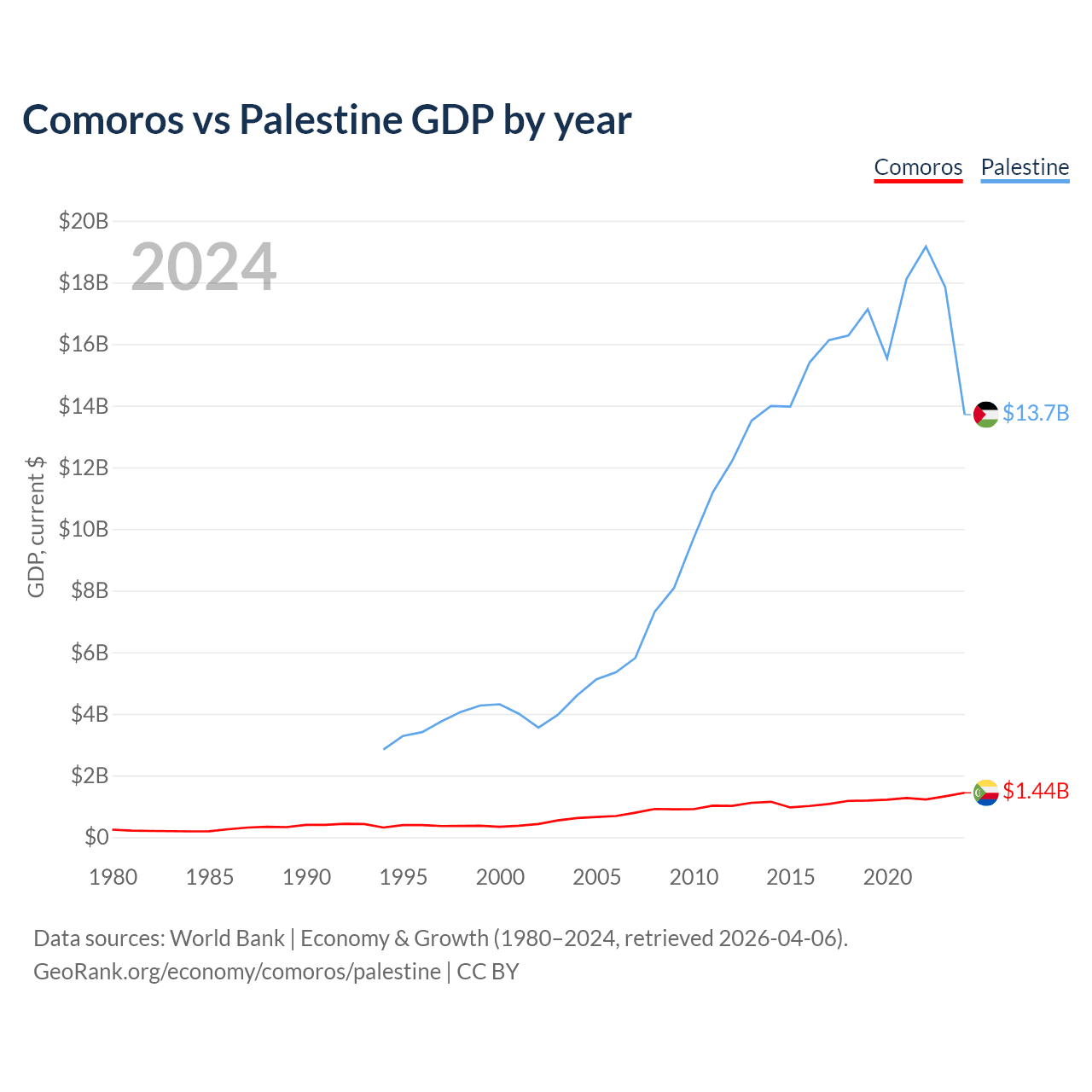 Comoros has a GDP of $1.44B compared to $13.7B for Palestine, ranking 183/197 and 146/197 by economy size, respectively.