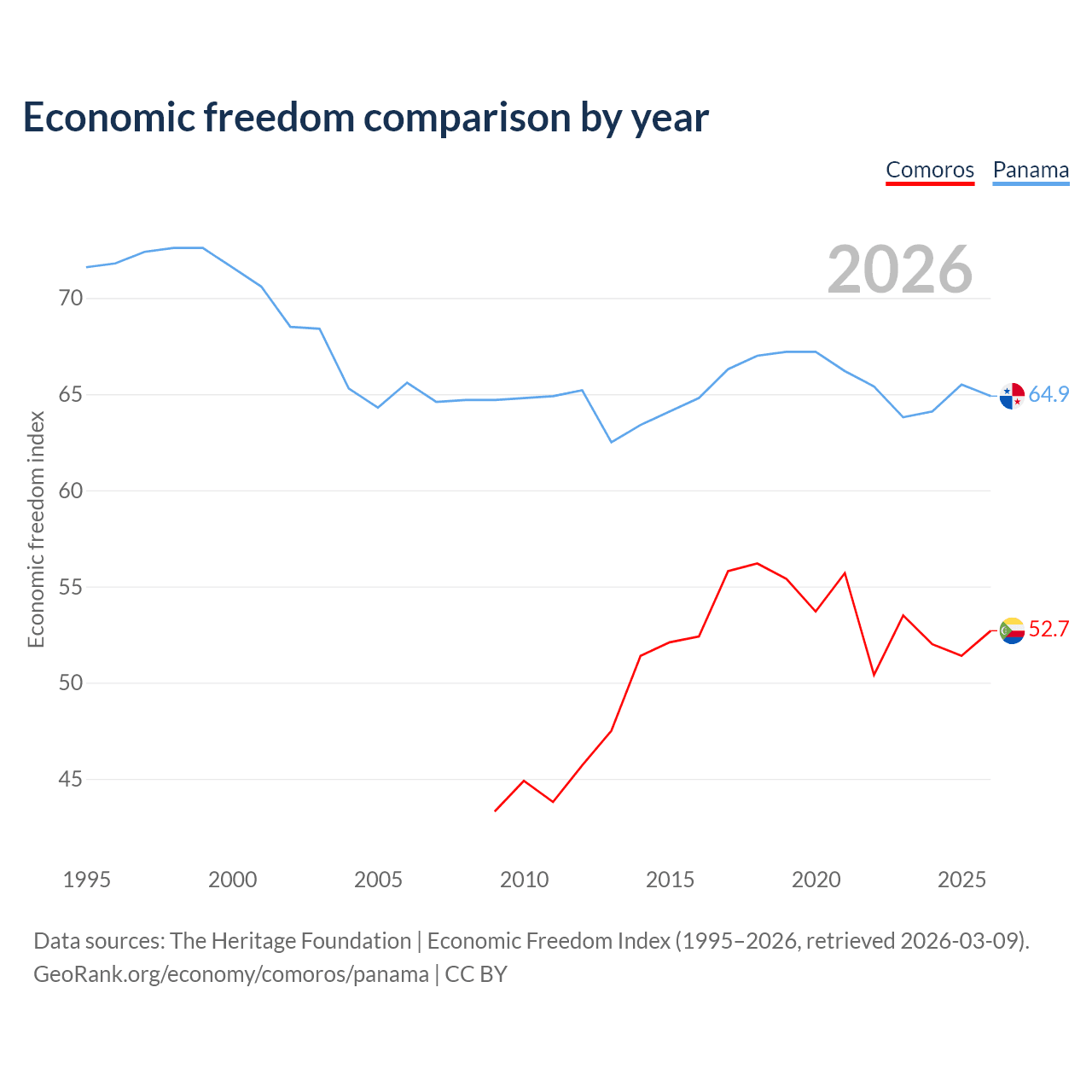 The Economic Freedom Index for Comoros is 52.7, ranking 145/197, compared to 64.9 for Panama, ranking 70/197. The chart above displays a comparison of annual changes in economic freedom indexes.