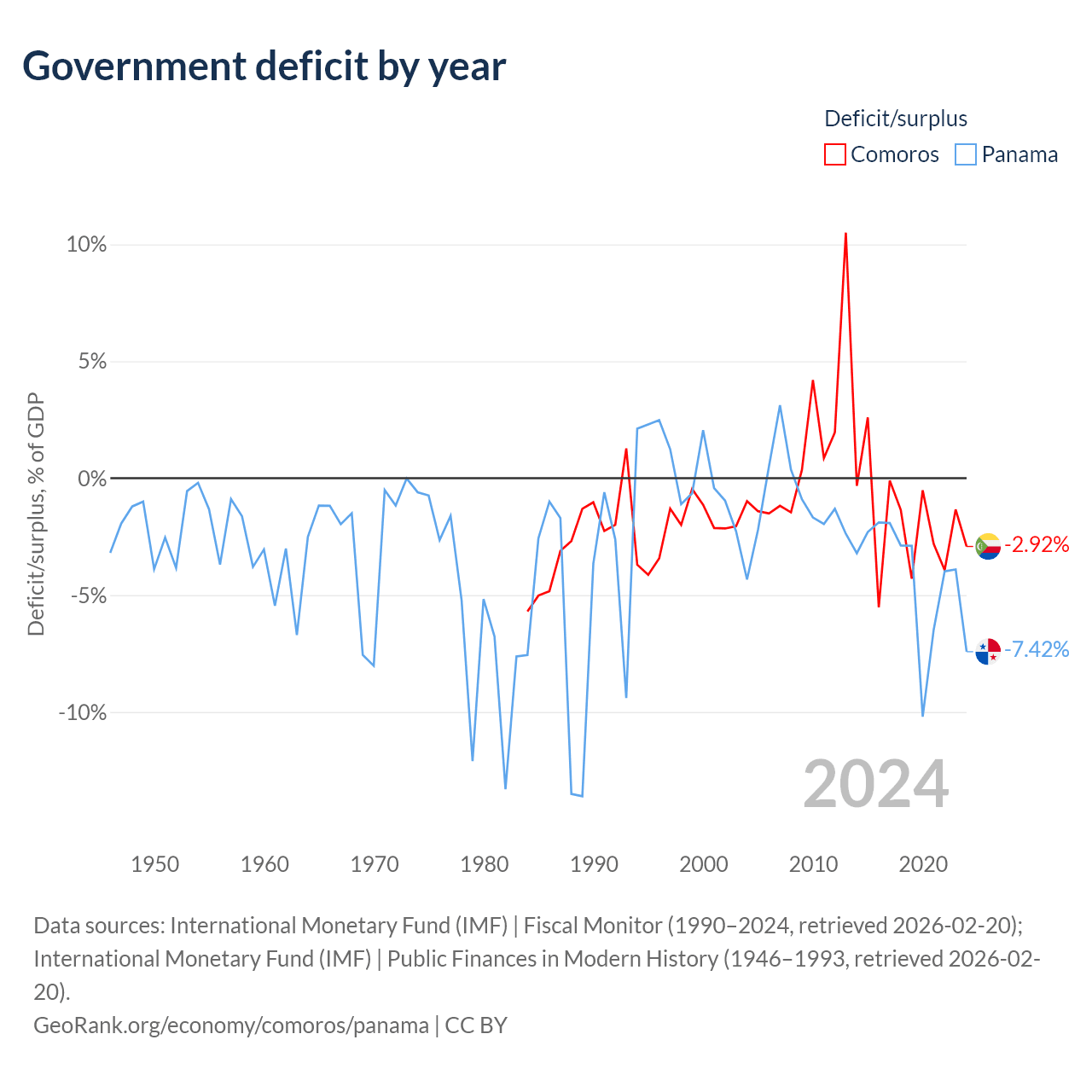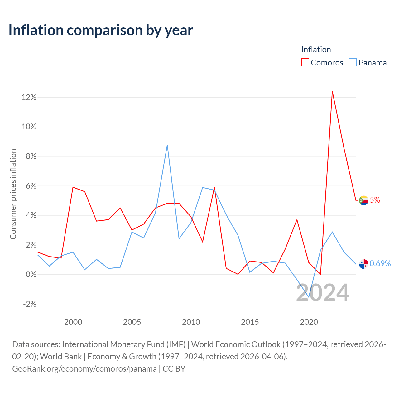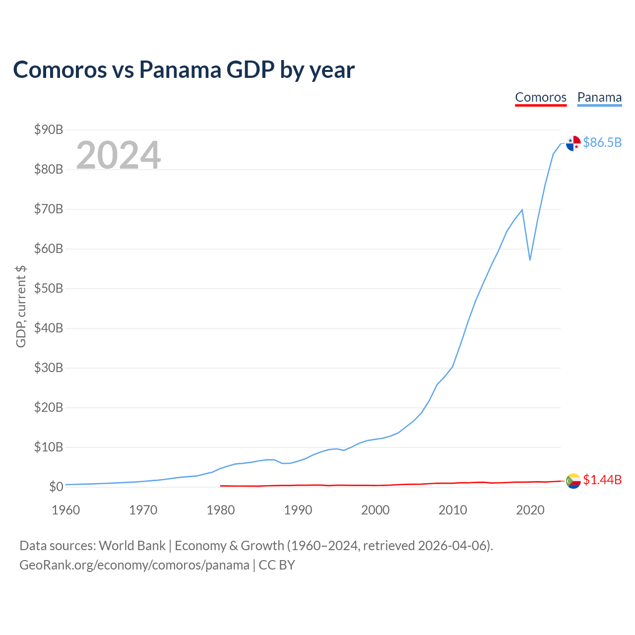 Comoros has a GDP of $1.44B compared to $86.5B for Panama, ranking 183/197 and 78/197 by economy size, respectively.