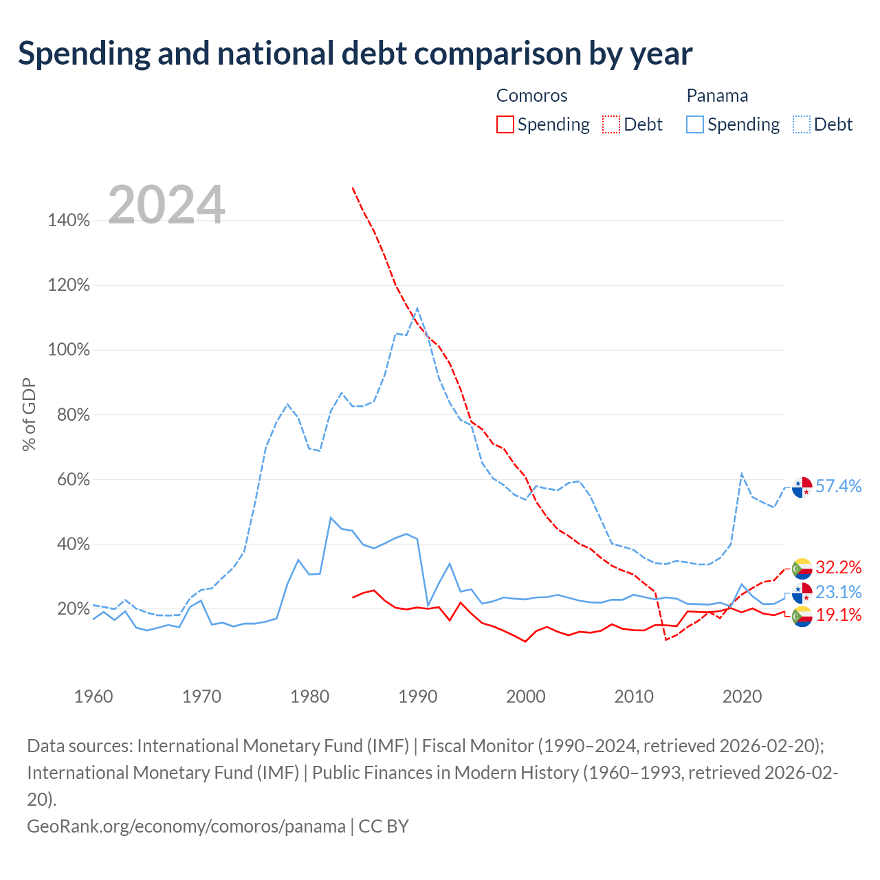 Comoros has $463M in government debt (32.2% of GDP), compared to $49.6B (57.4% of GDP) in Panama.