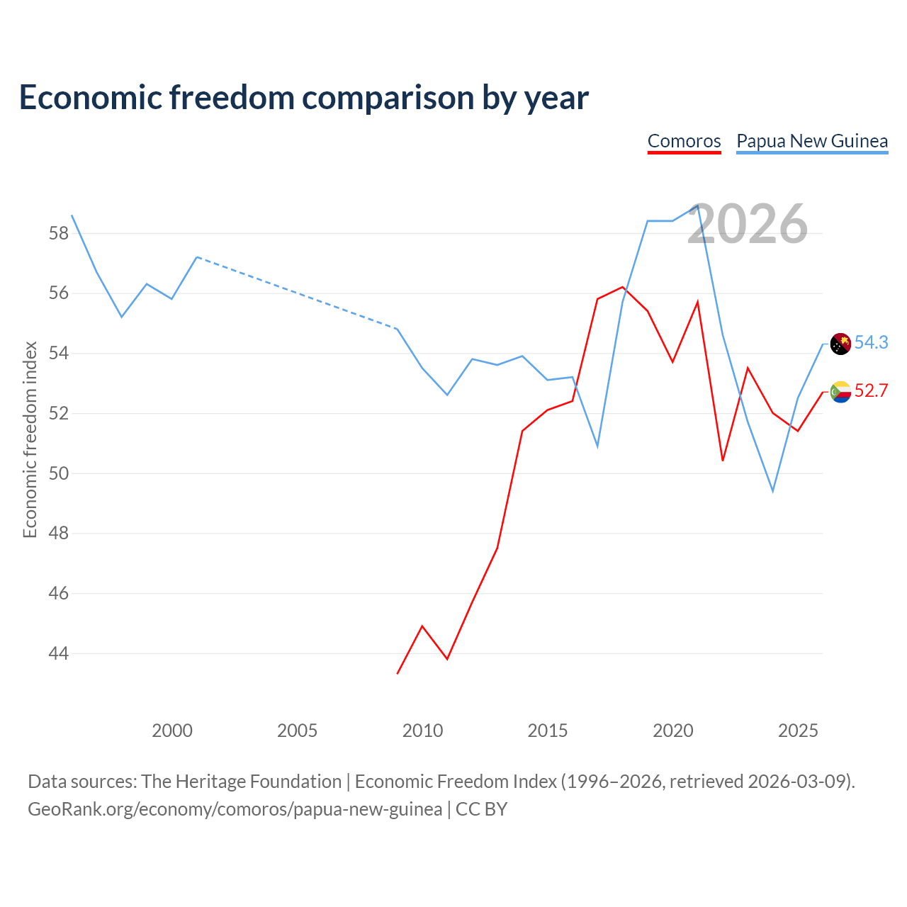 The Economic Freedom Index for Comoros is 52.7, ranking 145/197, compared to 54.3 for Papua New Guinea, ranking 134/197. The chart above displays a comparison of annual changes in economic freedom indexes.
