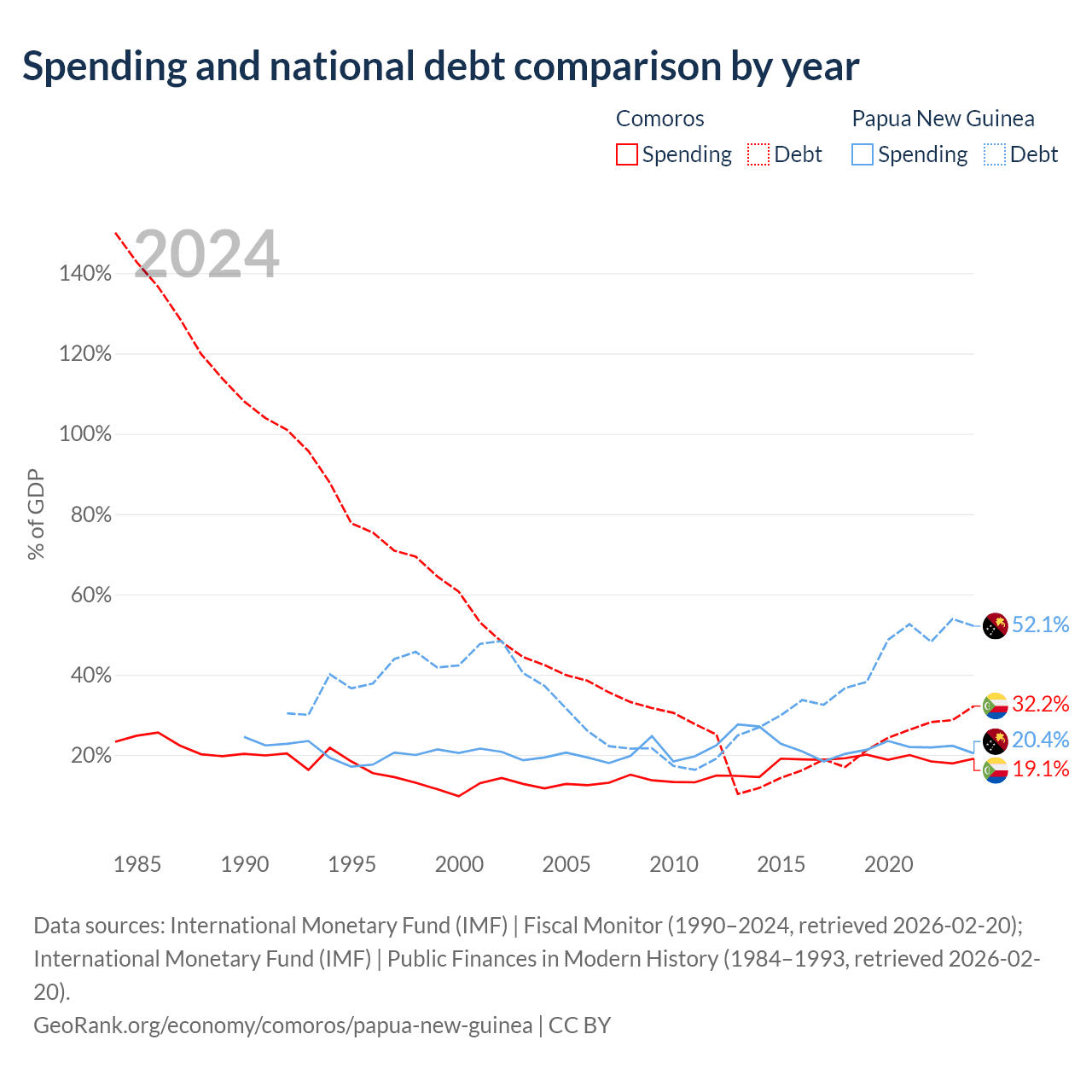 Comoros has $463M in government debt (32.2% of GDP), compared to $16.6B (52.1% of GDP) in Papua New Guinea.
