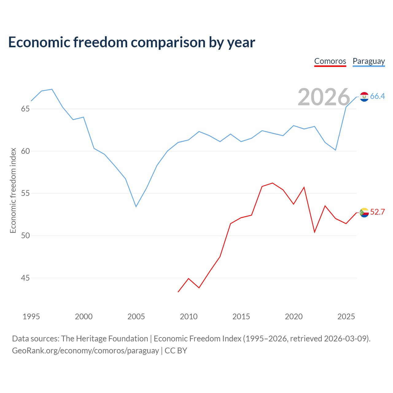The Economic Freedom Index for Comoros is 52.7, ranking 145/197, compared to 66.4 for Paraguay, ranking 61/197. The chart above displays a comparison of annual changes in economic freedom indexes.