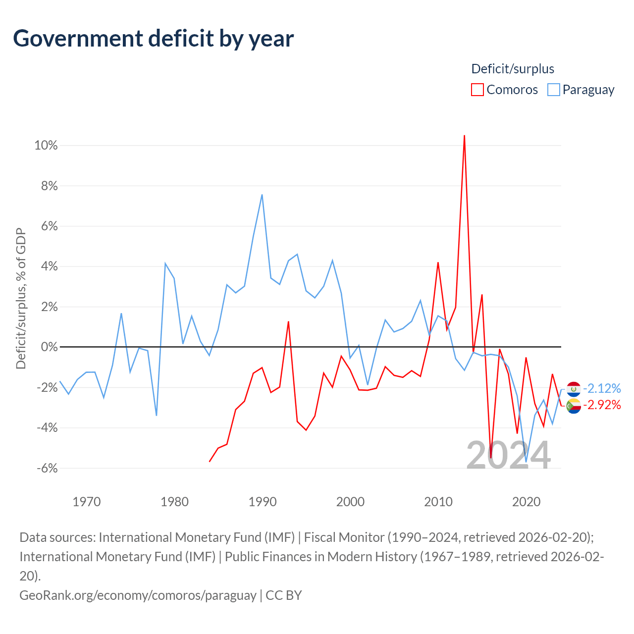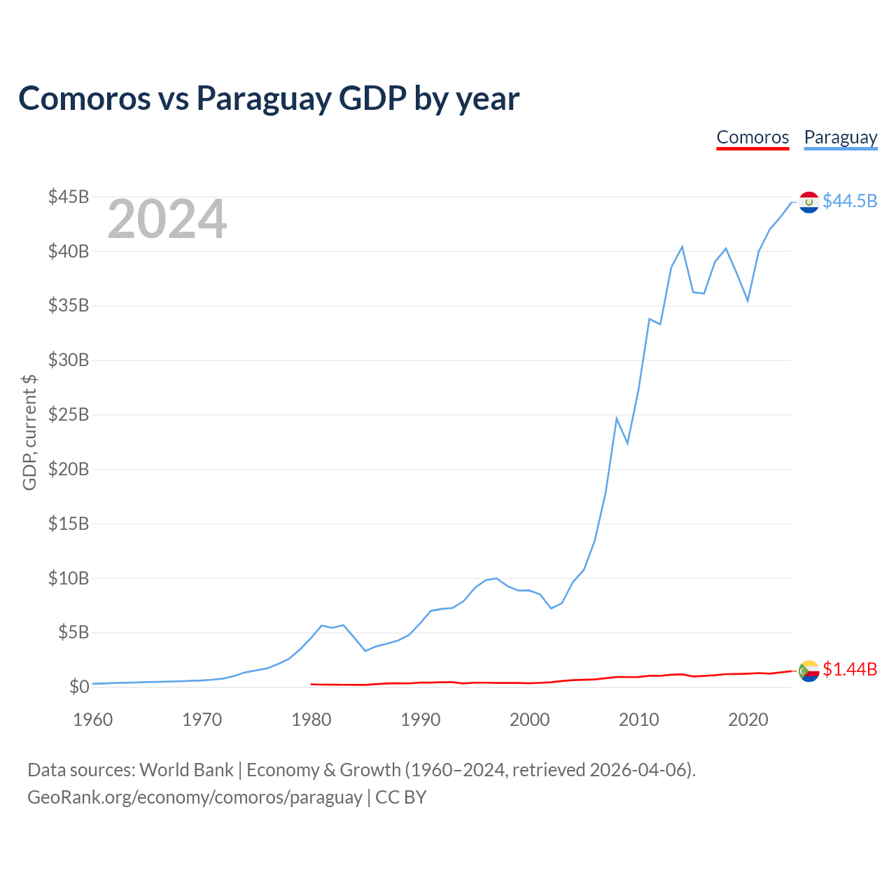 Comoros has a GDP of $1.44B compared to $44.5B for Paraguay, ranking 183/197 and 98/197 by economy size, respectively.